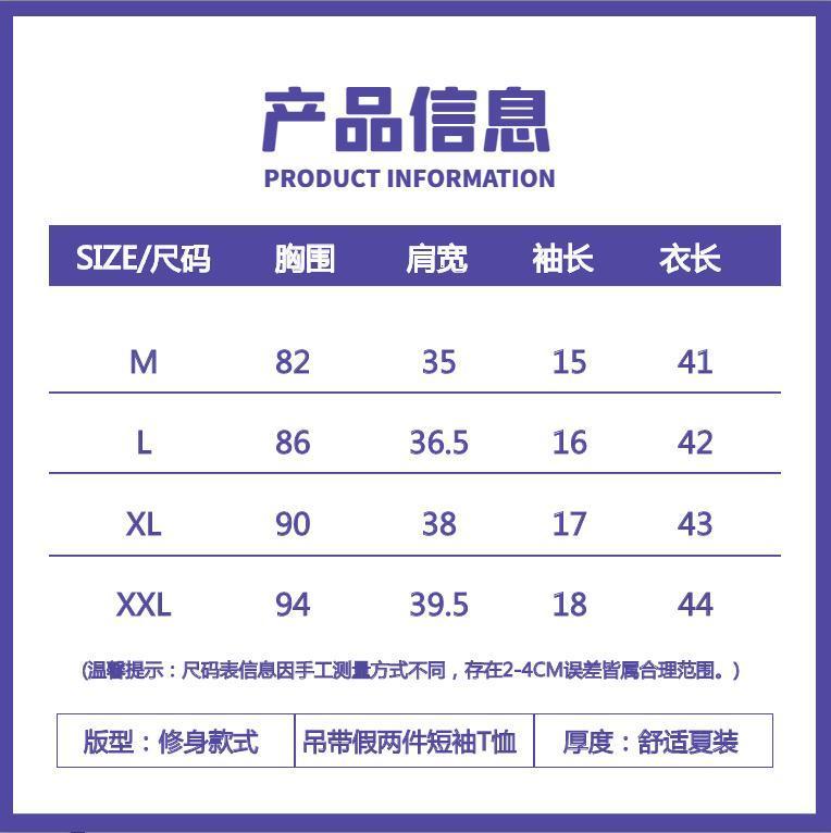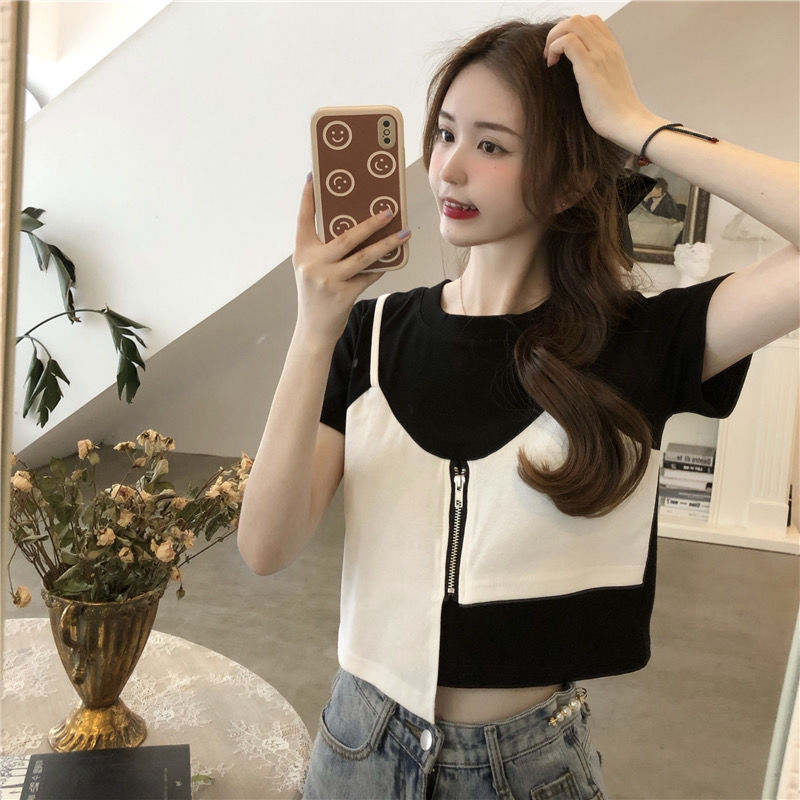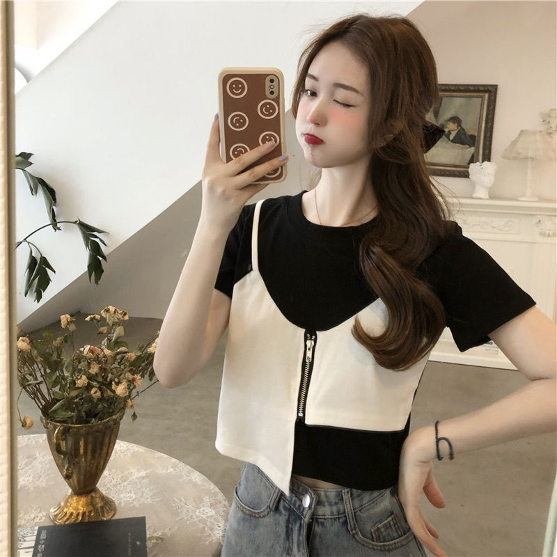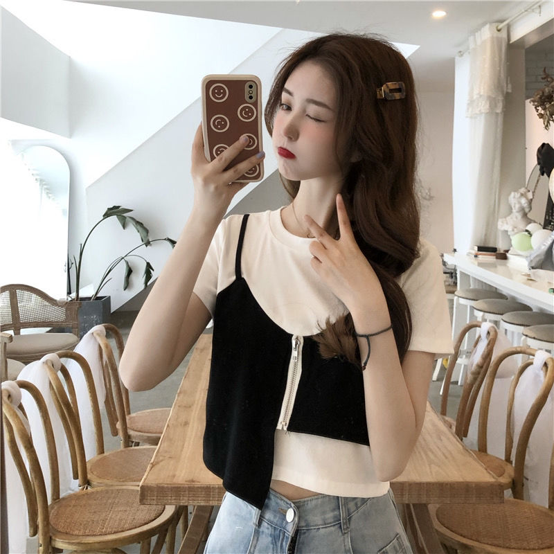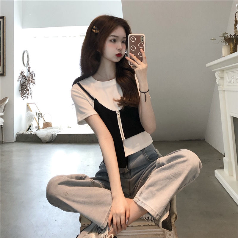 黛唯梵韩风chic上衣夏女装2022新款ins潮韩版显瘦假两件吊带拼接短款T恤国庆清明出游