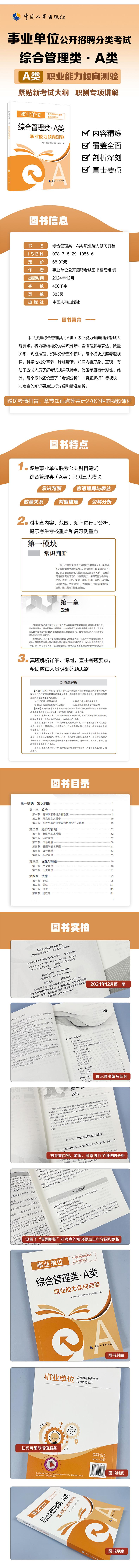 本书根据综合管理类(A类)职业能力倾向测验大纲和历年真题,精准分析考试涉及的能力框架和试题设计,全面系统地梳理了考试所需的知识点和技能,帮助应试人员掌握考试测查要素和解答思路。本书内容主要按照考试题型划分,分别为常识判断、言语理解与表达、数量关系、判断推理、资料分析。全书的特点主要有以下几个方面。(1)知识点覆盖全面。教材内容涵盖了事业单位职业能力倾向测验考试(A类)所需的所有知识点,并对重点和难点进行了深入剖析,帮助应试人员全面掌握考试内容。(2)实用性强。教材编写团队结合历年真题和考试趋势,对知识点进行了梳理和归纳,使应试人员能够更加高效地备考。(3)易于理解。教材采用了通俗易懂的语言和生动的例子,使应试人员能够轻松地掌握知识点,提高应试能力。