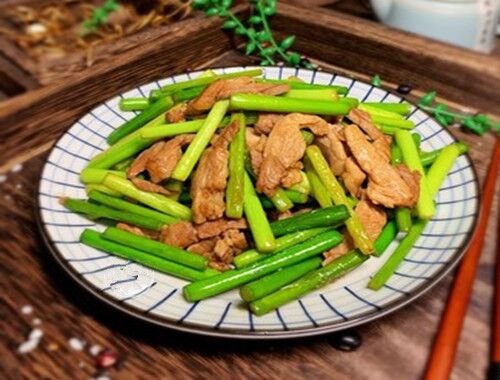 4.下蒜薹,单独翻炒几下,再和入肉丝翻炒几下