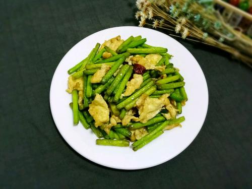 6.炒之前,起热油锅,下一个鸡蛋炒散盛出备用,等肉和蒜薹炒至九成熟后倒入鸡蛋同炒至熟,多一份风味