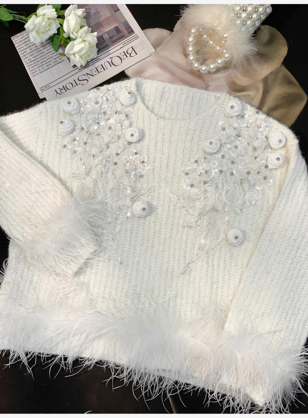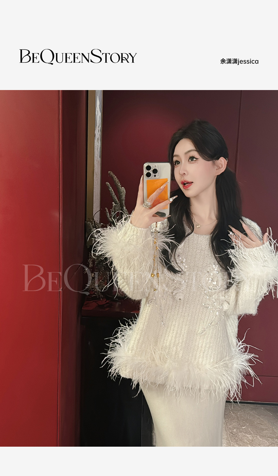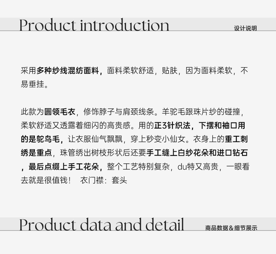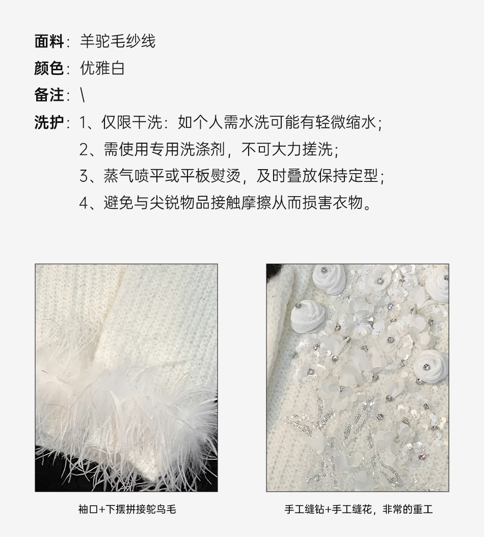 【孤品样衣,不退不换】【甜梦契约】冬季氛围花朵羊驼毛拼接鸵鸟毛圆领毛衣