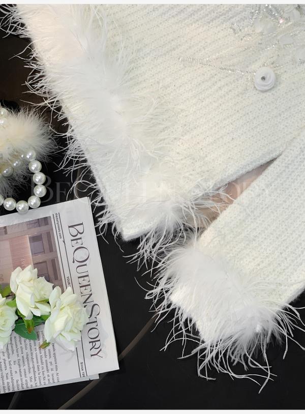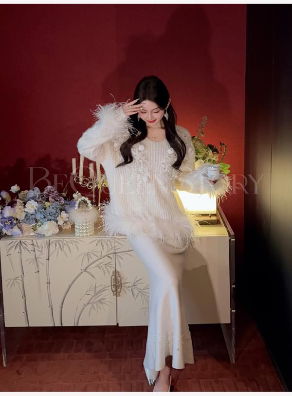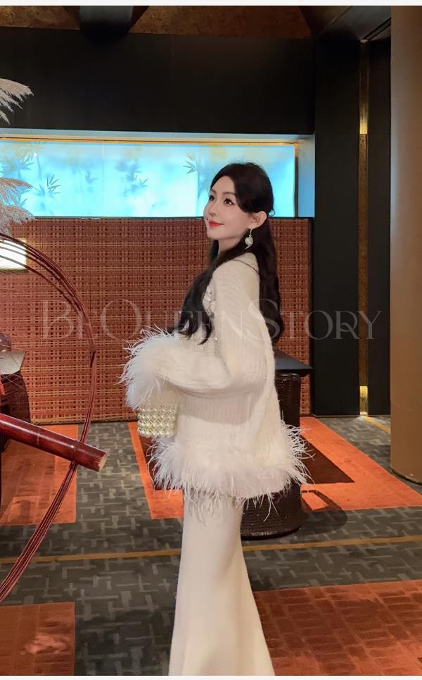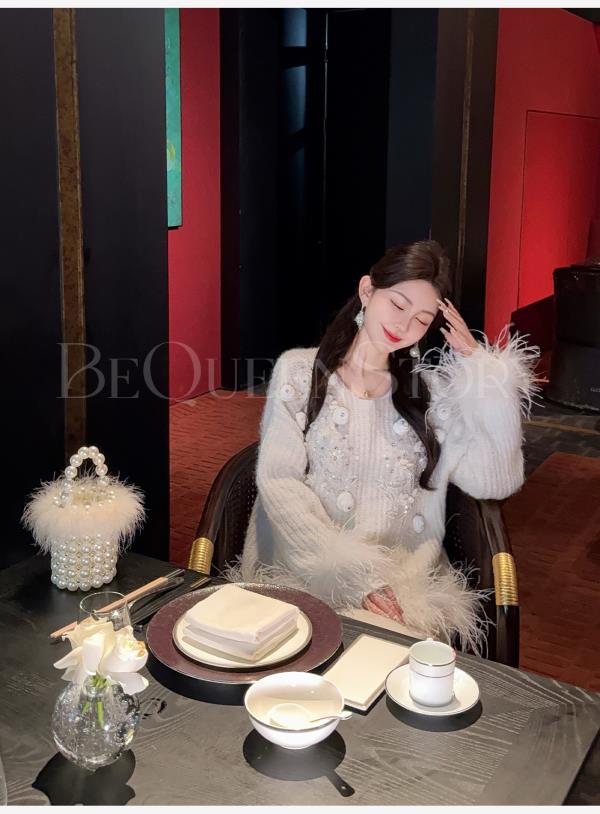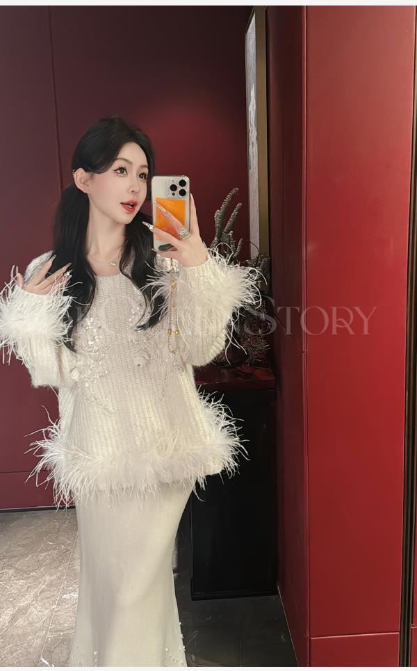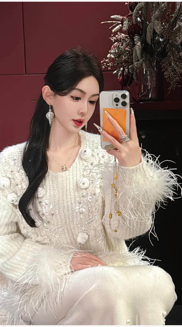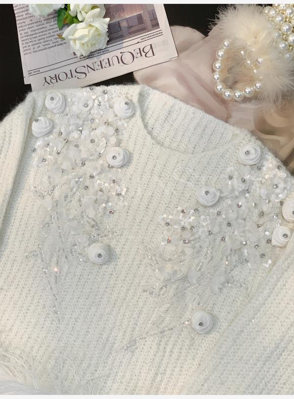 【孤品样衣,不退不换】【甜梦契约】冬季氛围花朵羊驼毛拼接鸵鸟毛圆领毛衣