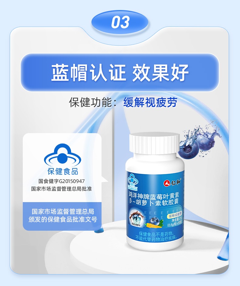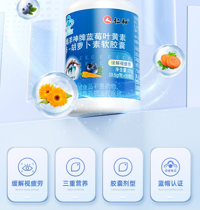 【蓝帽认证,改善眼部亚健康!】仁和鸿洋神牌蓝莓叶黄素-胡萝卜素软胶囊 改善成人儿童视力工作学习眼睛不累 50粒/瓶
