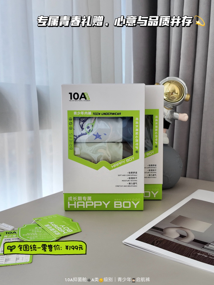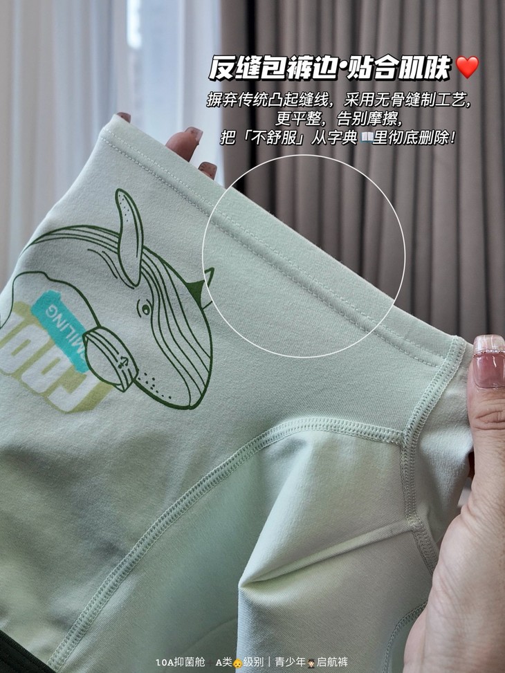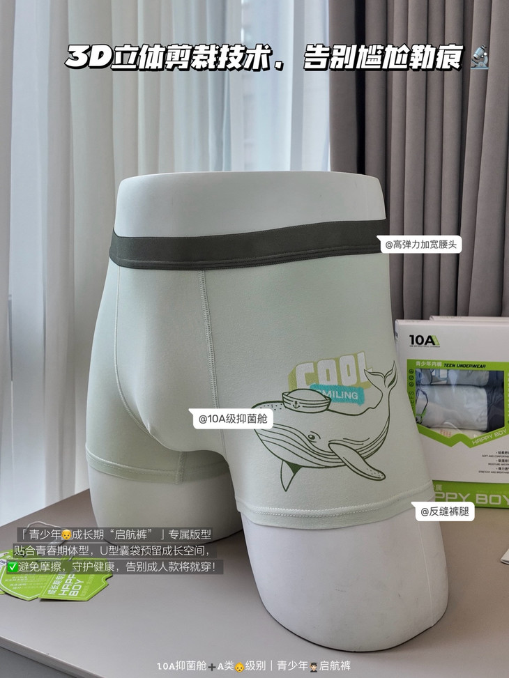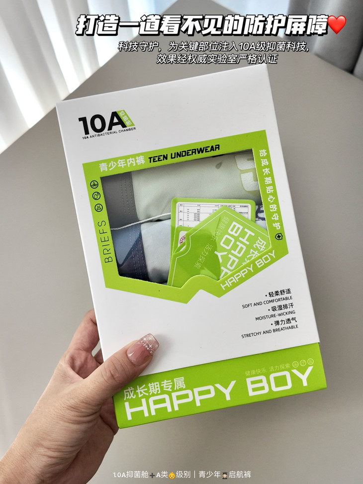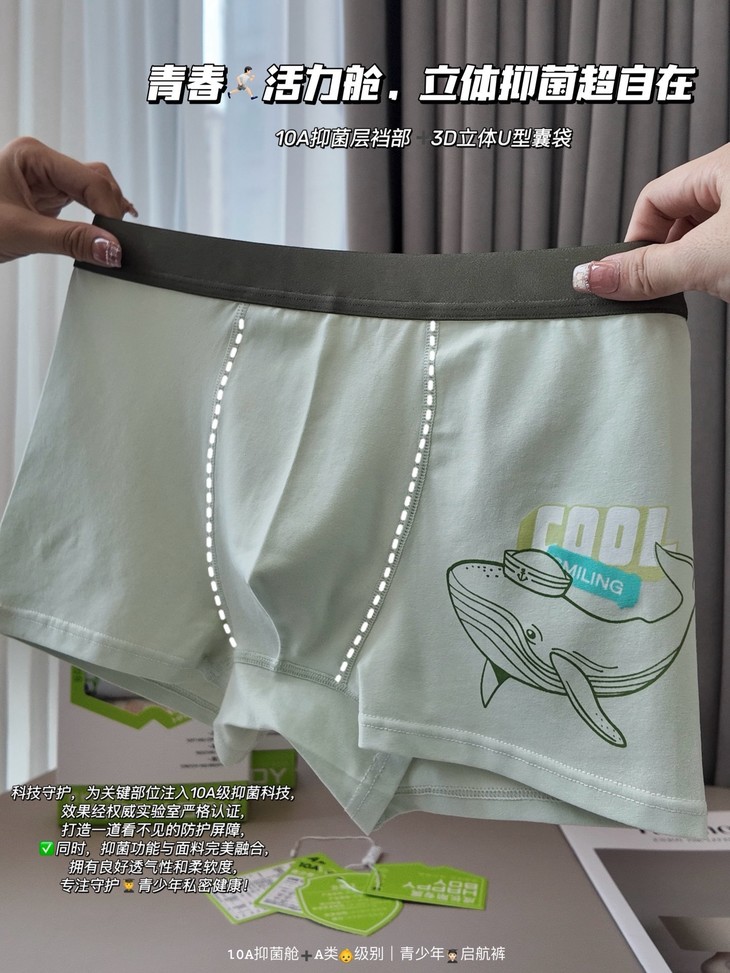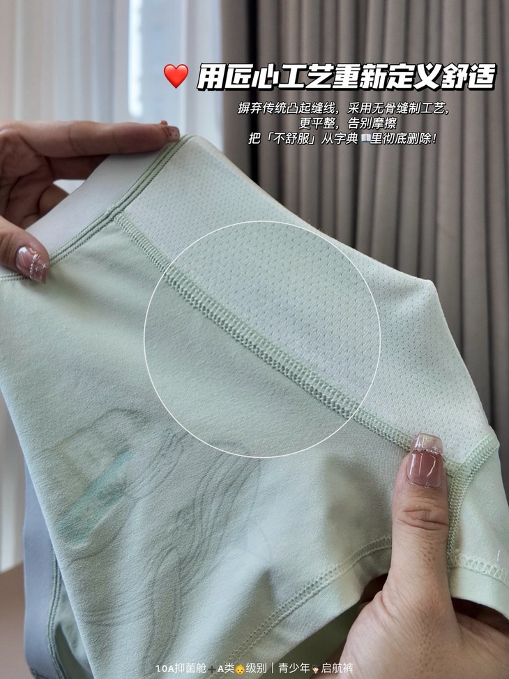 🎬4⃣️10A级抑菌“太空舱”#科技守护,为关键部位注入10A级抑菌科技,效果经权威实验室严格认证 打造一道看不见的防护屏障,✅同时,抑菌功能与面料完美融合,拥有良好透气性和柔软度,专注守护👨🎓青少年私密健康!