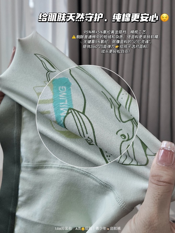 🎬为什么它值得选择?✅五大核心优势,守护👦成长每一步! ❶ 「专属版型」3D立体裁剪,贴合不紧绷,为成长期量身定制,活动🏃自由! ❷「安全无虞」远超国家标准的A类婴幼儿👶🏻安全材质,亲肤0刺激! ❸ 「黄金配比」95%精梳棉+5%氨纶,会呼吸的软弹☁️包裹感,穿上就不想脱下来! ❹「健康防护」搭载10A级抑菌裆部,构建主动防护屏障🧑⚕️,避免细菌滋生困扰! ❺「舒适体验」无感标签+无骨缝制,彻底解决勒肉、夹臀、摩擦等!