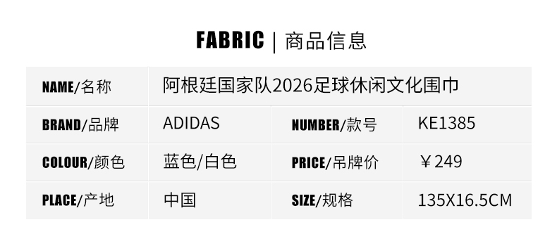 SFS阿迪达斯Adidas2026阿根廷足球文化运动休闲保暖围巾男KE1385