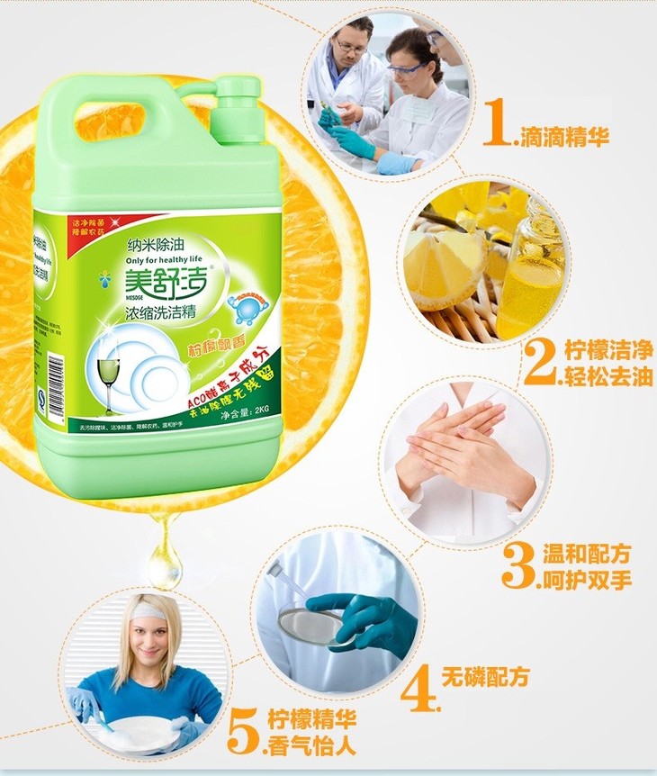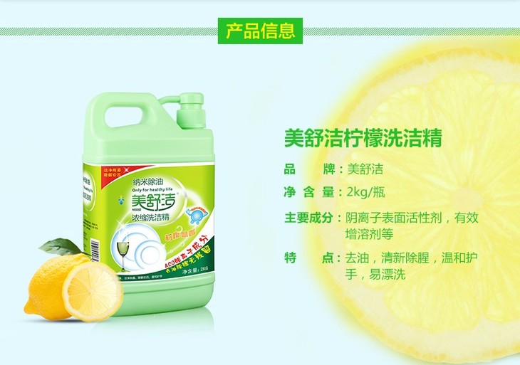 美舒洁 洗洁精 2kg 促销瓶装 柠檬去油污 大桶 家庭装 洗碗液