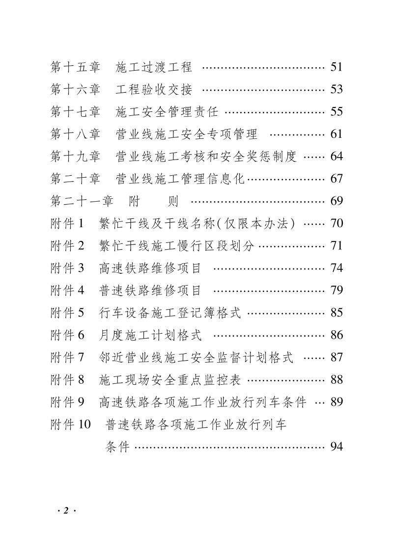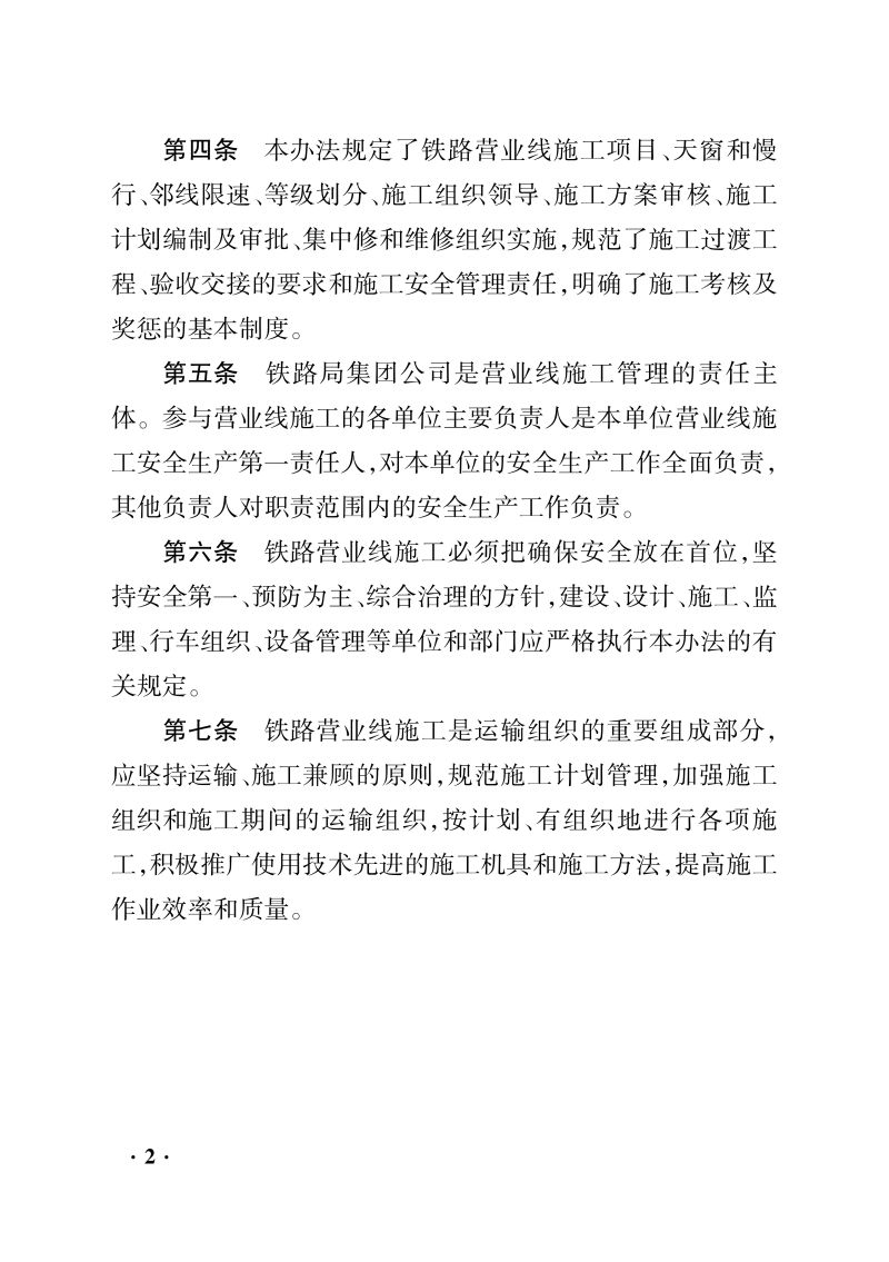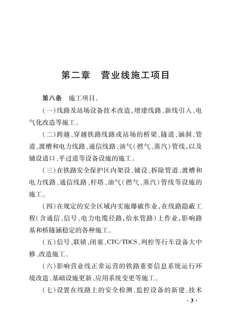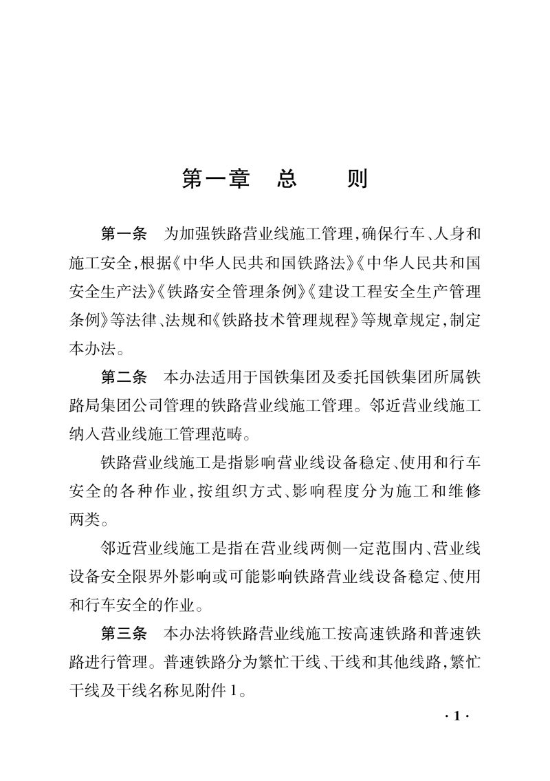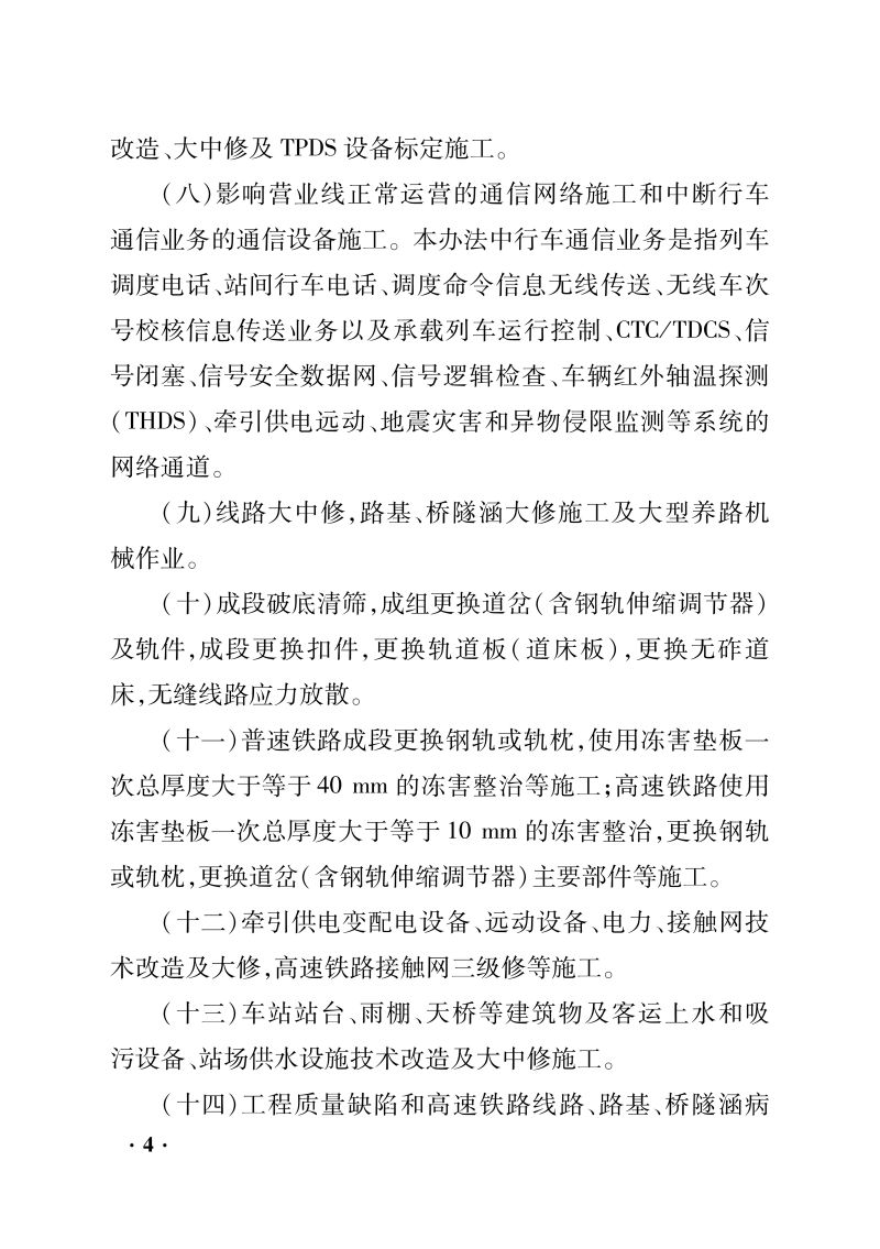 《国铁集团铁路营业线施工管理办法》是国铁集团根据现阶段的铁路营业线施工实际重新修订的施工管理办法,包含总则、营业线施工项目、天窗、慢行和邻线限速、营业线施工登记、营业线施工组织领导、营业线施工计划审批权限、营业线施工方 案审核、营业线施工计划、计划变更及临时施工、跨局通信施工、邻近营业线施工、维修组织实施、集中修组织实施、营业线施工登销记等内容,共二十一章和7个附件,约5万字,拟定于2021年12月1日实施。
