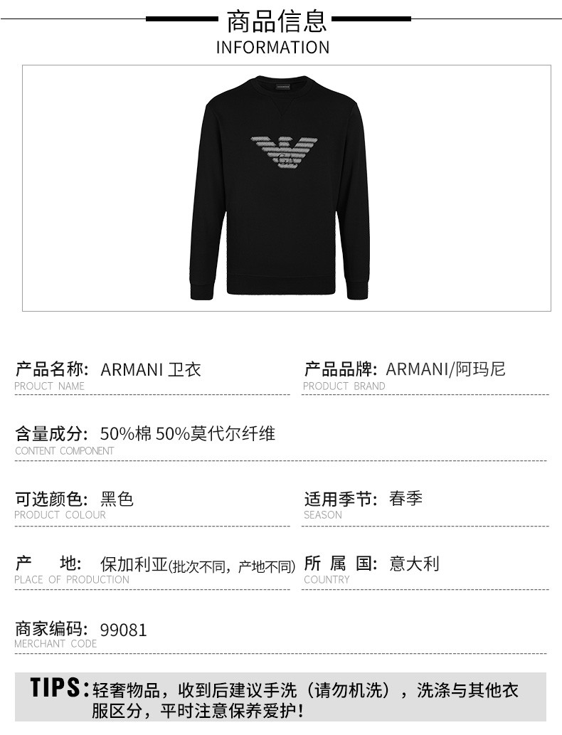 阿玛尼(ARMANI) 男装 男士休闲印花图案圆领长袖卫衣 99081