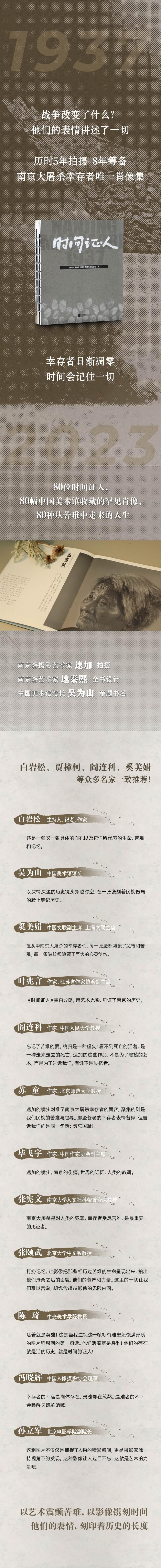2016年,应侵华日军南京大屠杀遇难同胞纪念馆邀请,南京籍摄影艺术家速加走近南京大屠杀幸存者群体,开始了长达5年的拍摄历程,捕捉记录南京大屠杀幸存者的珍贵影像,并写下摄影手记。本书收录速加镜头下80幅幸存者肖像及幸存者对当时场景的回忆文字,首次以幸存者肖像特写和群像的艺术形式回溯1937年南京大屠杀这场人类浩劫,以艺术光影见证南京的历史,以高度凝练的艺术语言,显现战争对个人、家庭、城市、民族和国家造成的无法估量的创伤和影响。这是一部时间之书、记忆之书,也是一部人类之书、和平之书。