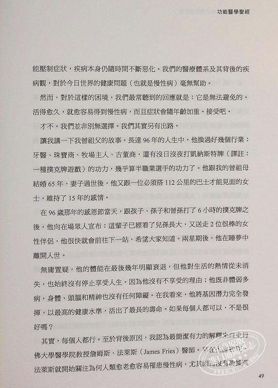 2.在慢性病發生之前,就終結它:現在我們可以找出特定對象的慢性病成因,並利用本書中詳述的方式,讓慢性病畫下句點。不僅如此,在慢性病的症狀出現前,我們就能就找到成因,並透過早期介入加以預防。這是革命性的轉變;不亞於當年發現疫苗接種與抗生素能夠控管傳染病之後,醫界經歷的典範轉移。作者稱之為「功能醫學革命(Functional Medicine revolution)」。