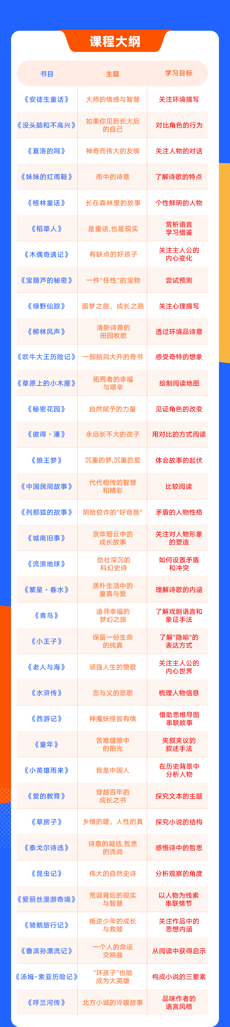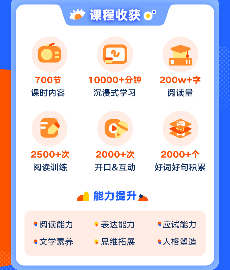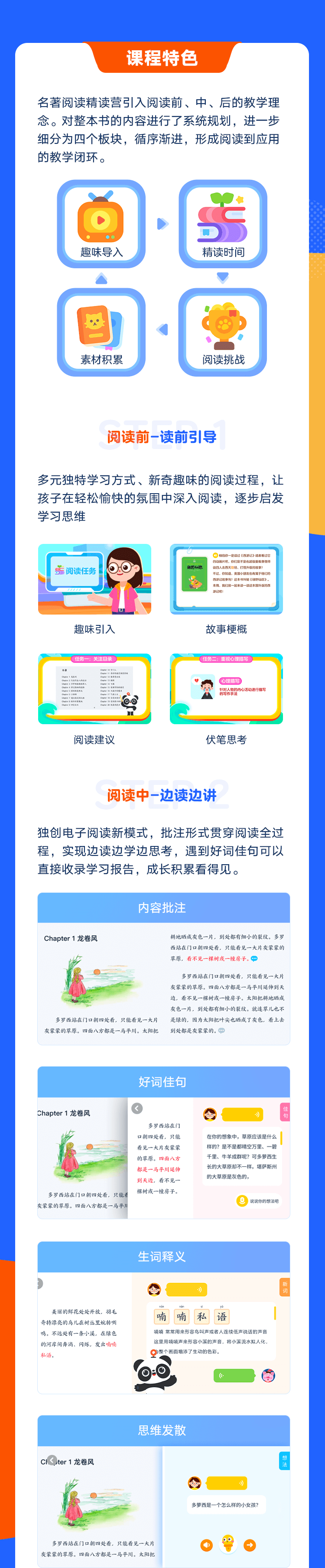 课程内容:36本名著、700节课时、10000+分钟学习、 2500+次阅读训练、2000+个好词佳句积累