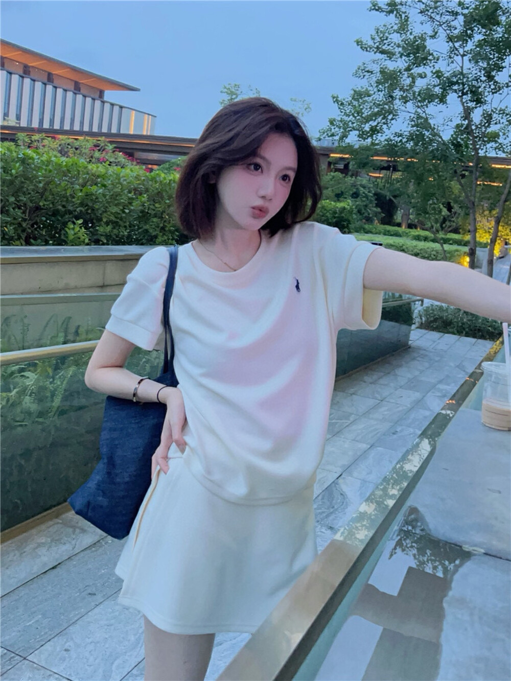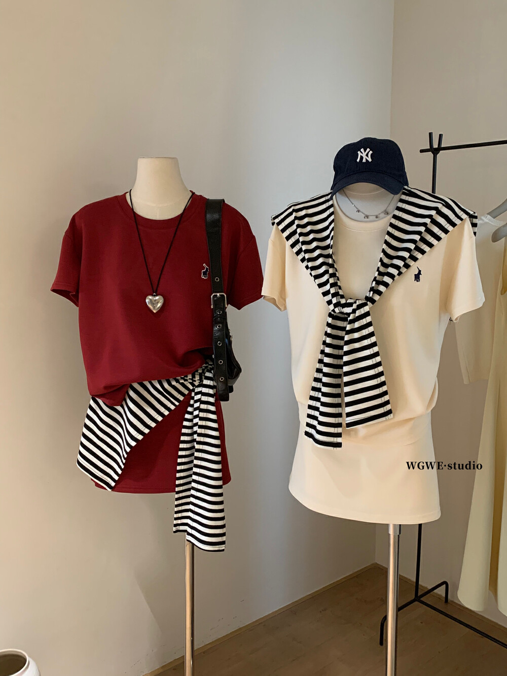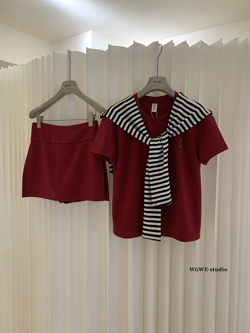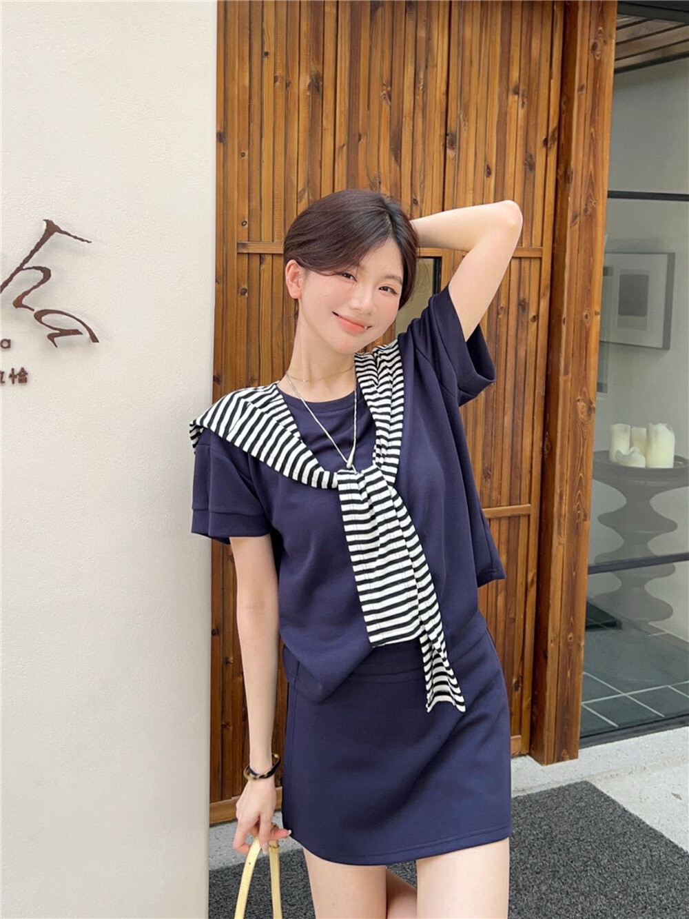 【GZ】无忧购韩系慵懒风盐系休闲圆领短袖T恤+高腰短裙半身裙套装(配披肩)W5218#(截单后7天发货)