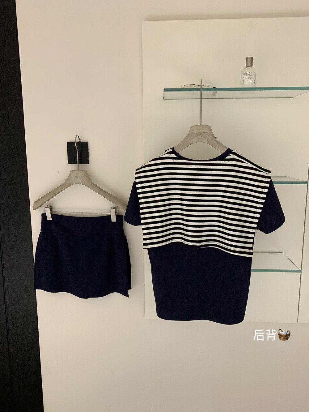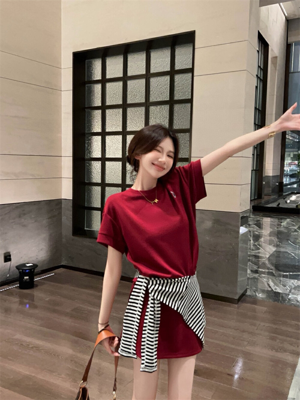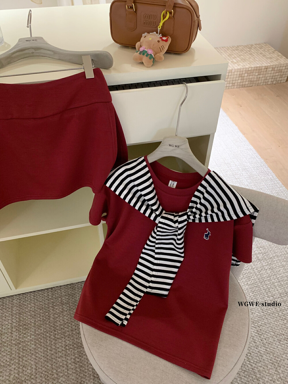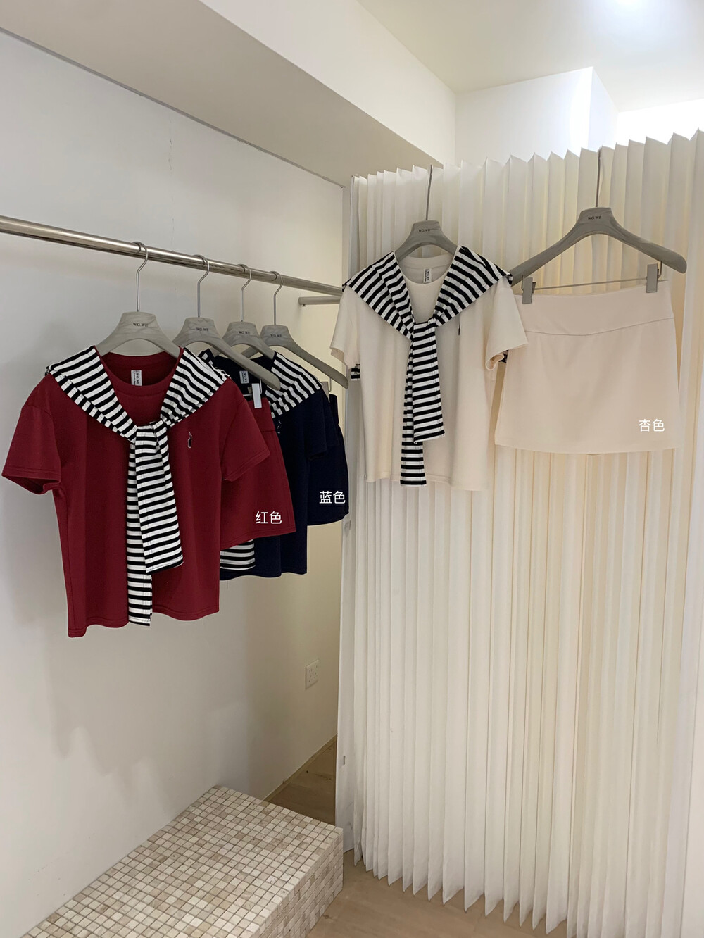 【GZ】无忧购韩系慵懒风盐系休闲圆领短袖T恤+高腰短裙半身裙套装(配披肩)W5218#(截单后7天发货)
