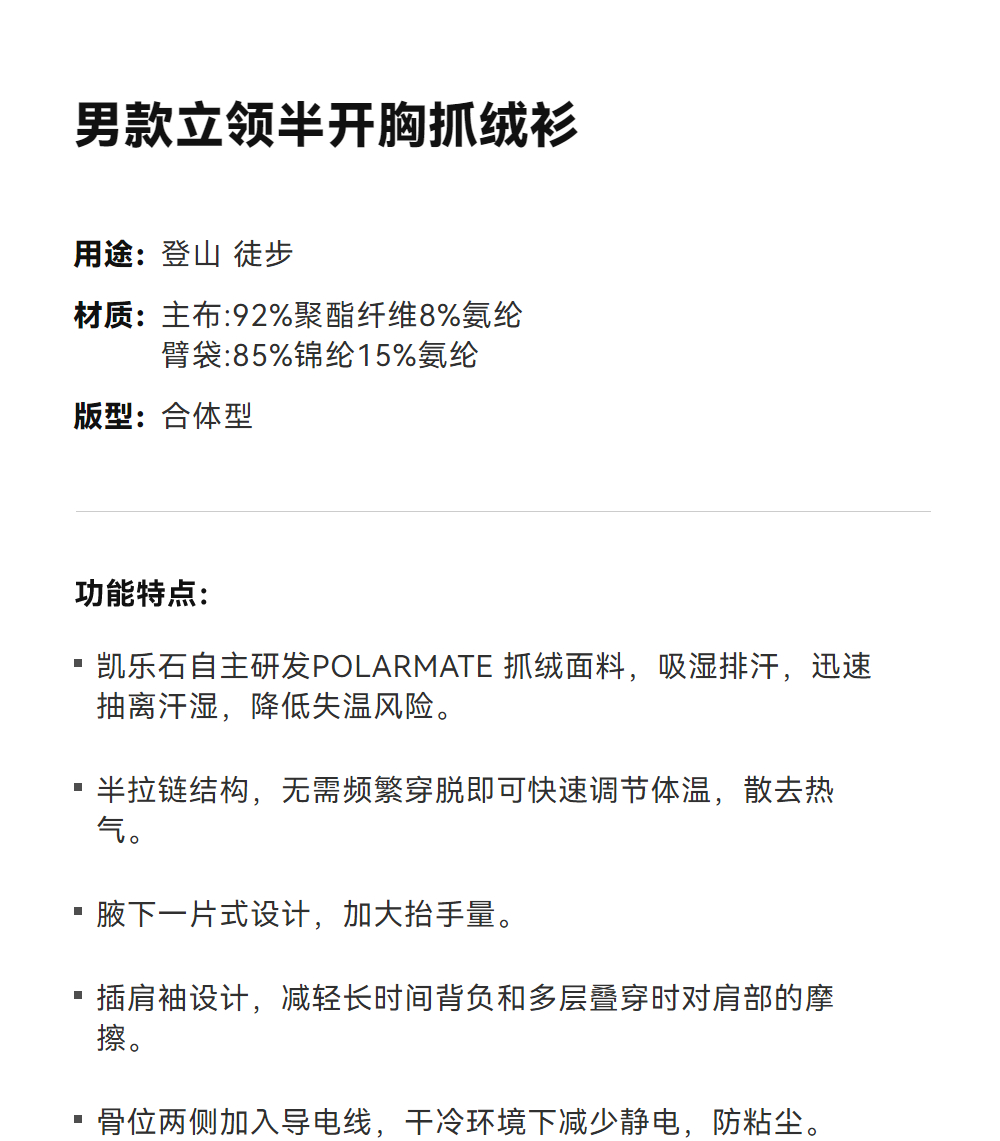 KAILAS凯乐石 男款立领半开胸抓绒衫 KG2532180