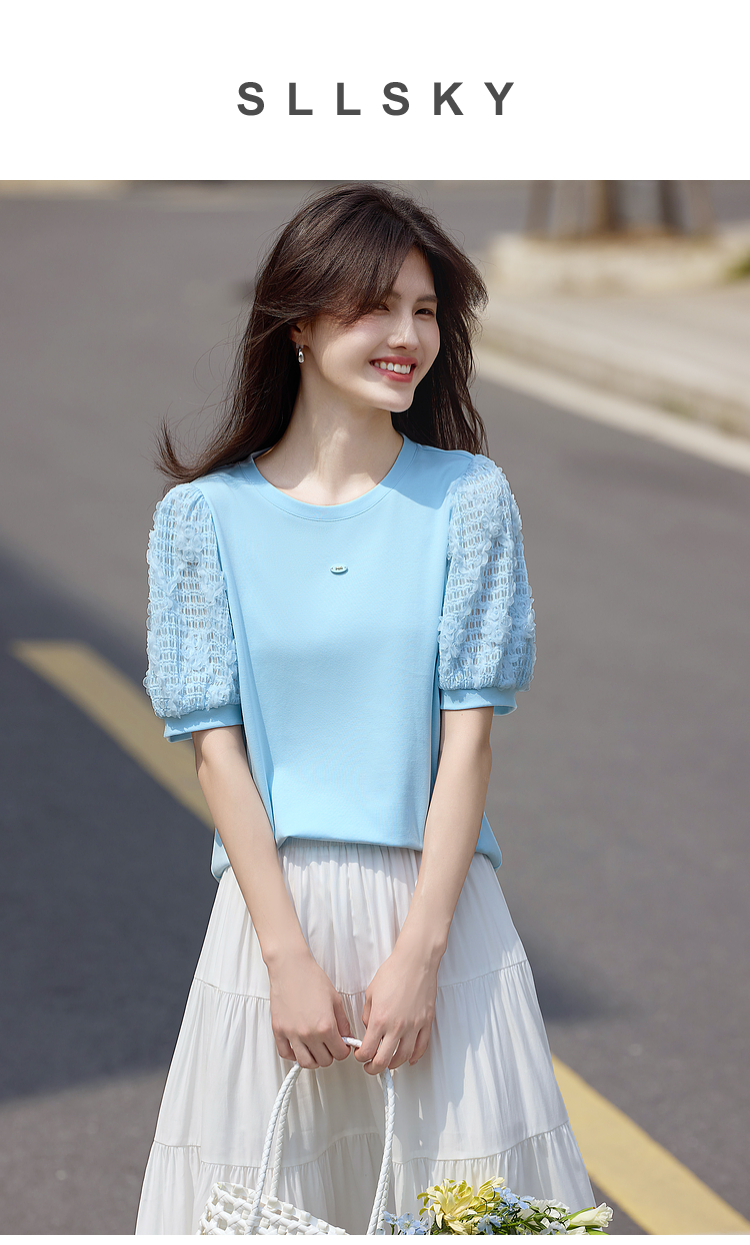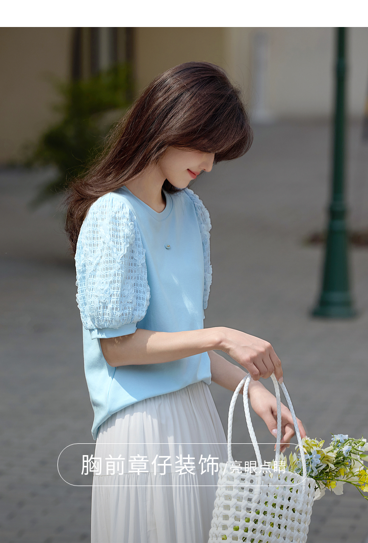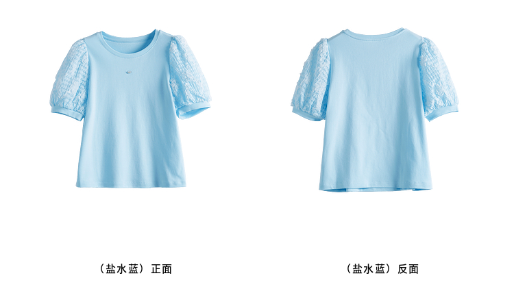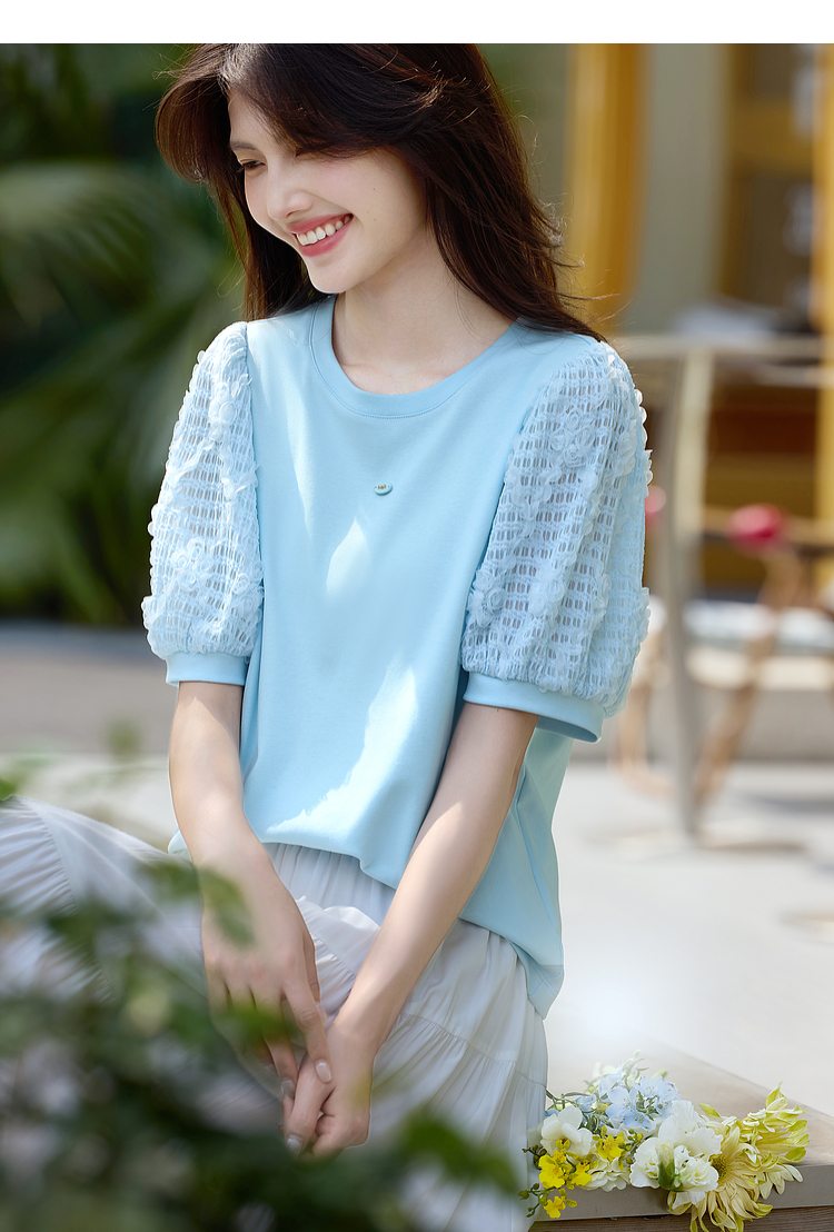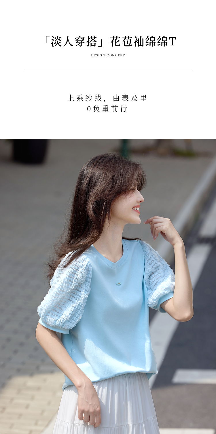 熙世界设计感花苞袖蓝色T恤女夏季休闲宽松显瘦圆领上衣2025新款