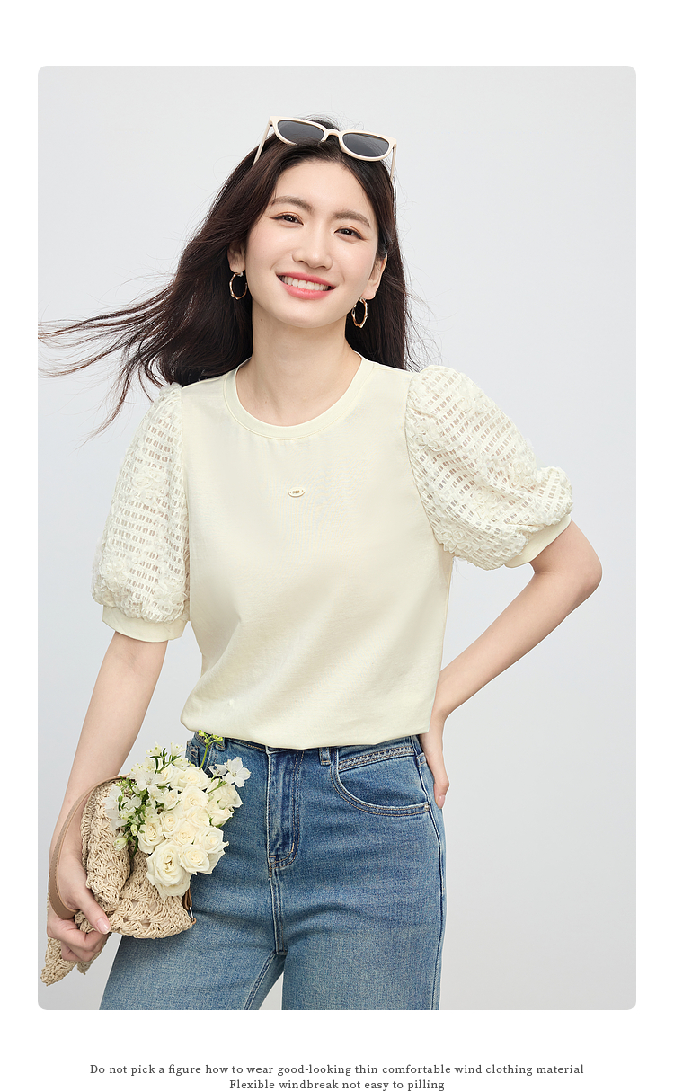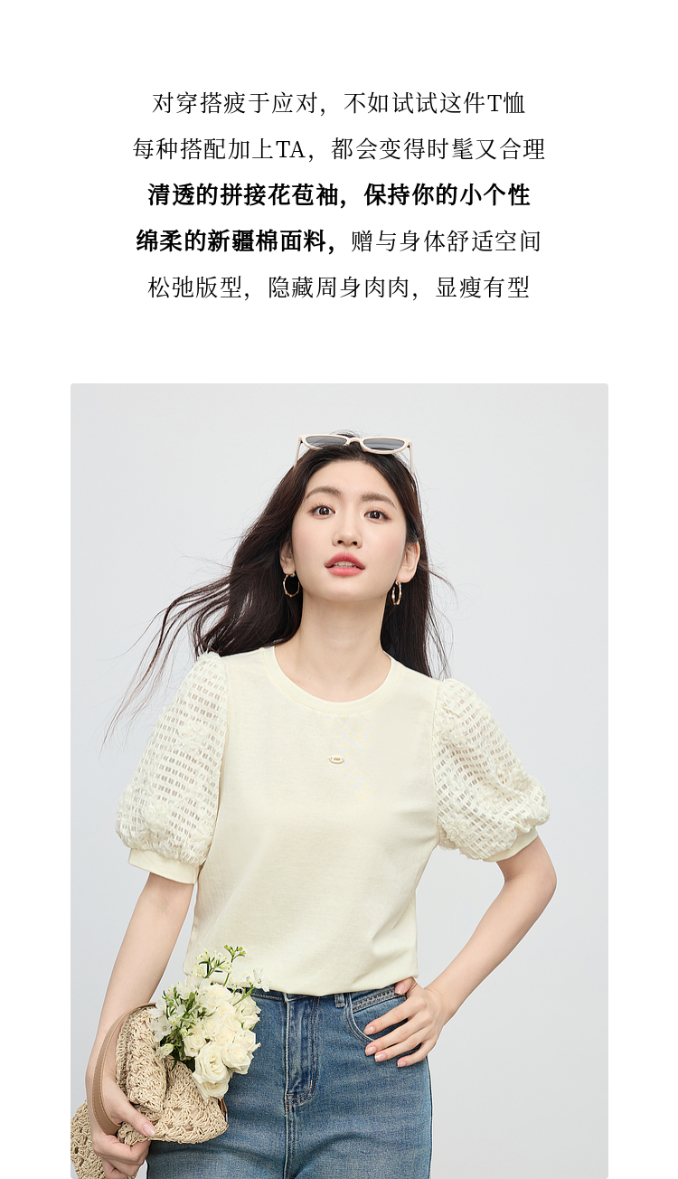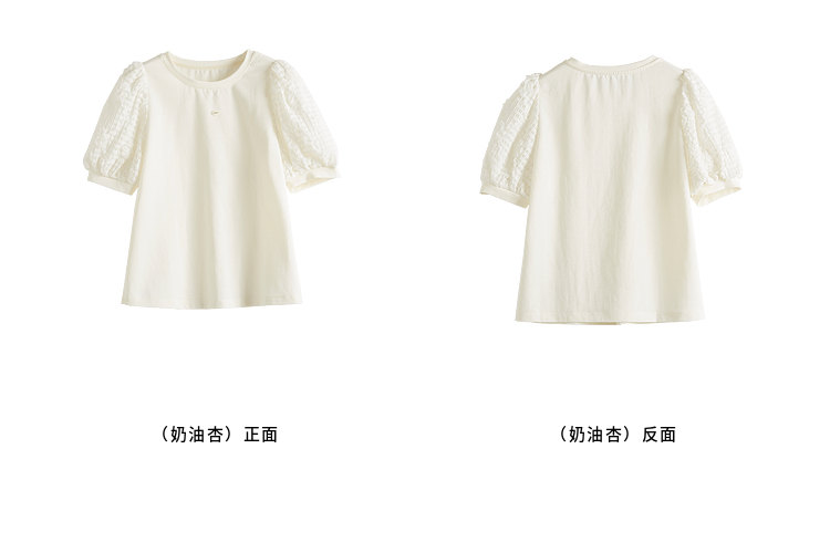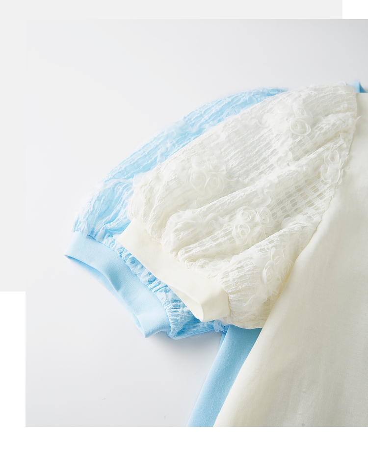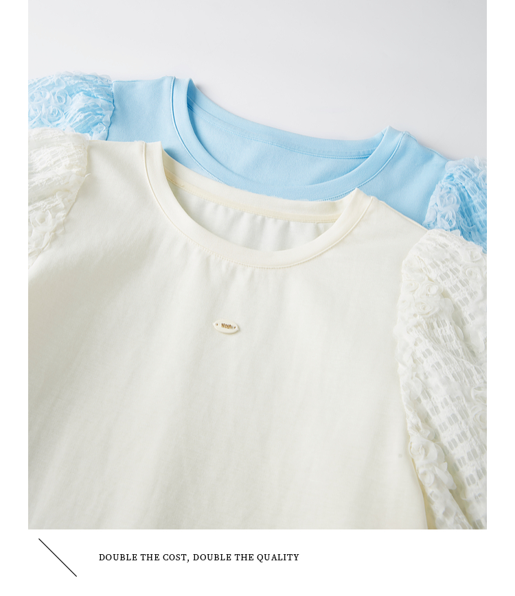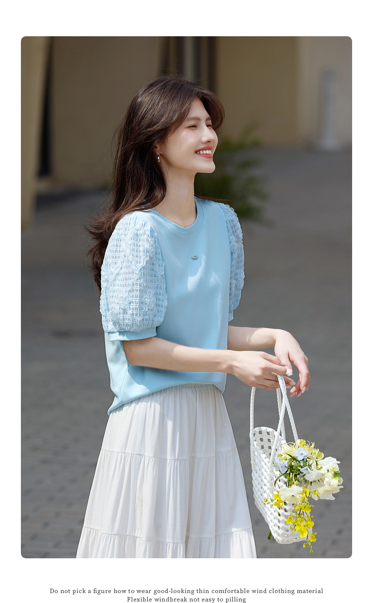 熙世界设计感花苞袖蓝色T恤女夏季休闲宽松显瘦圆领上衣2025新款