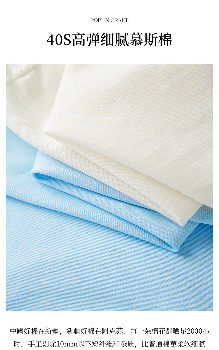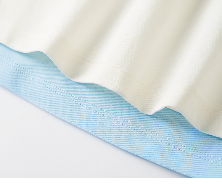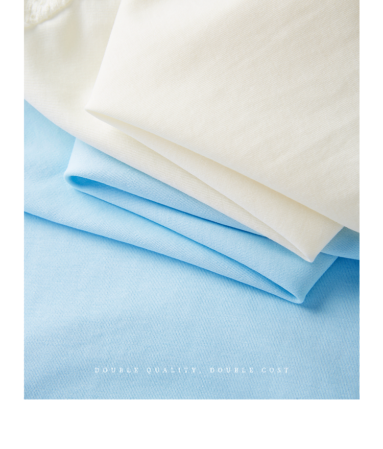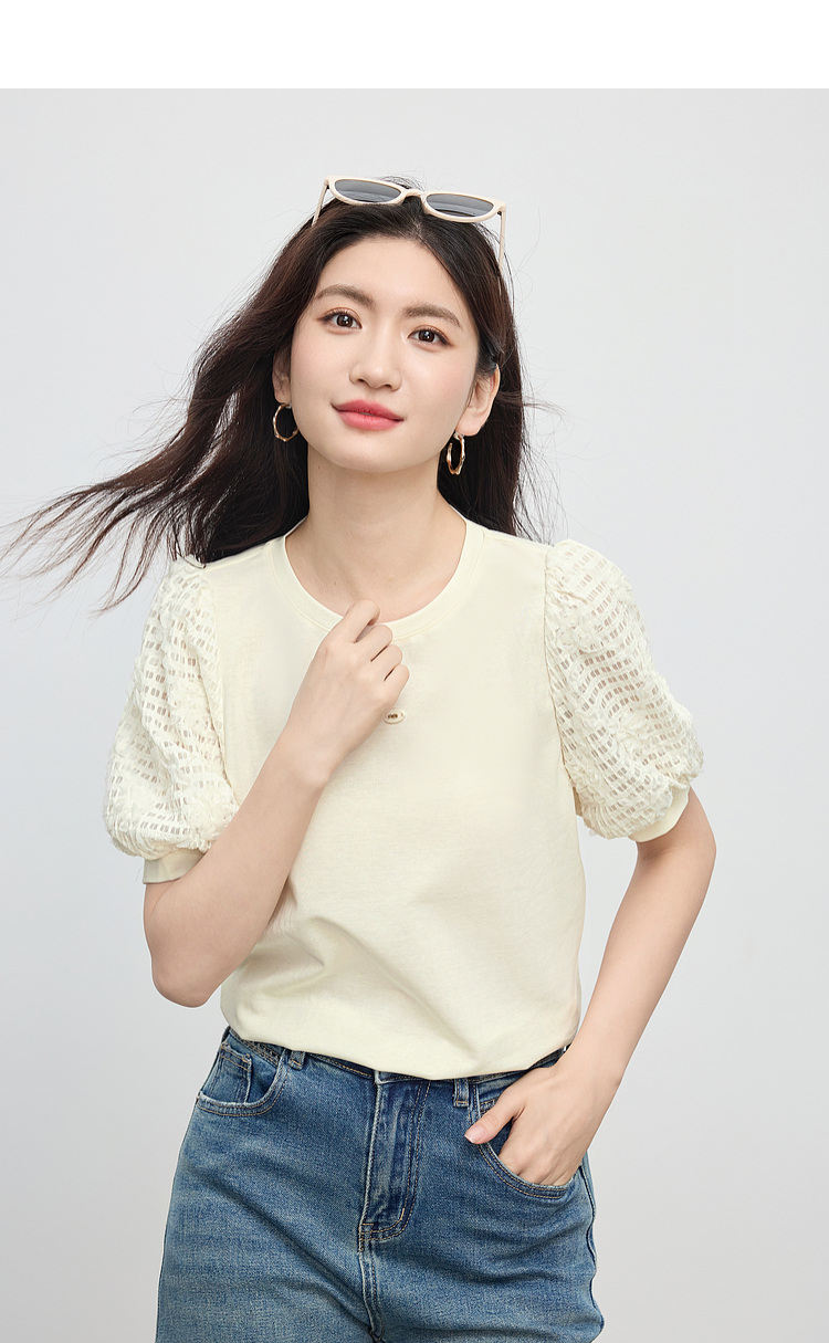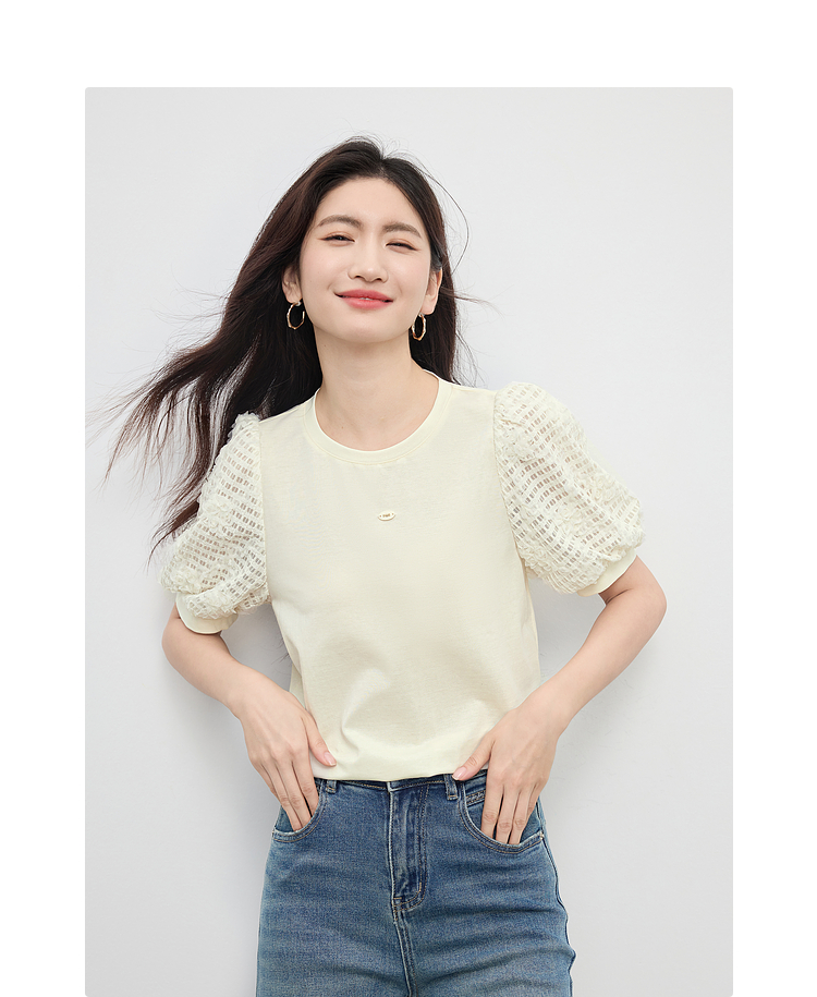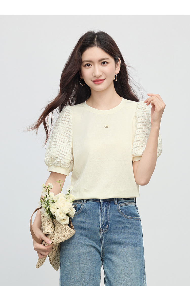 熙世界设计感花苞袖蓝色T恤女夏季休闲宽松显瘦圆领上衣2025新款