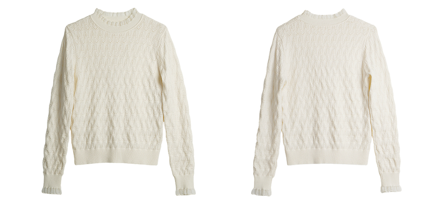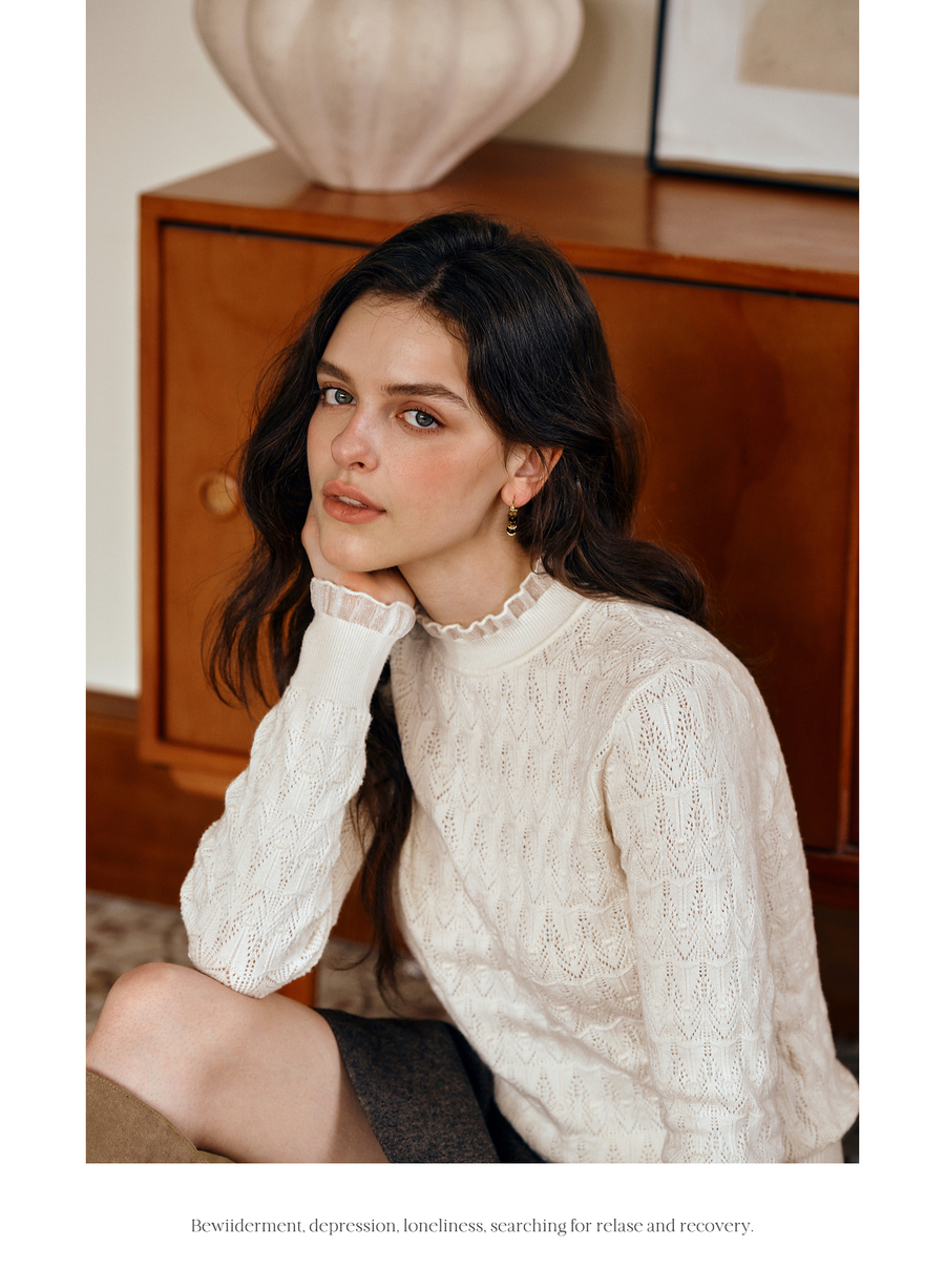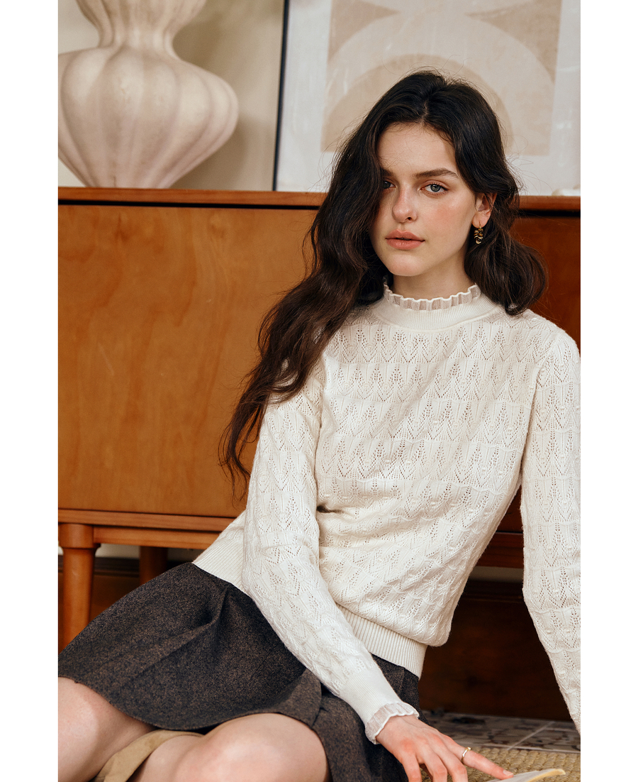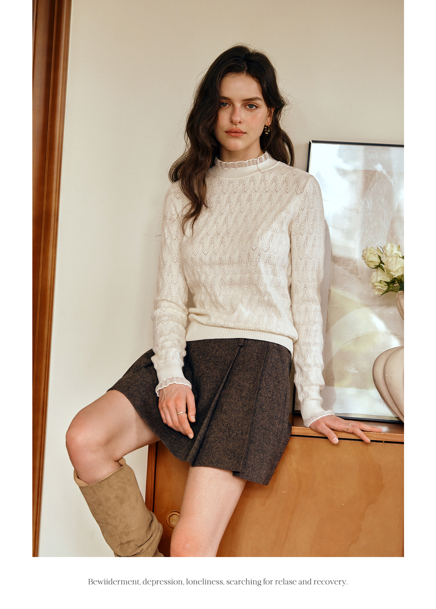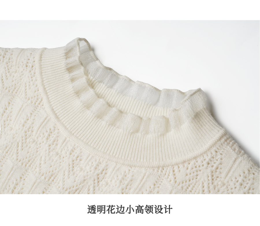 OLrain欧芮儿荷叶边镂空织花毛针织套头衫女秋季2025新款长袖上衣