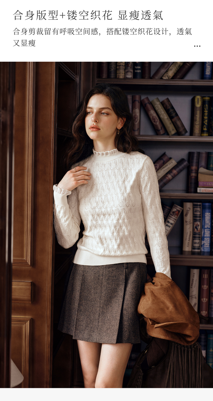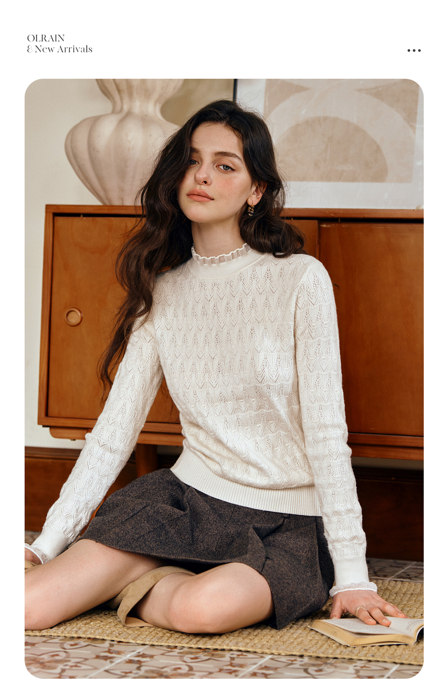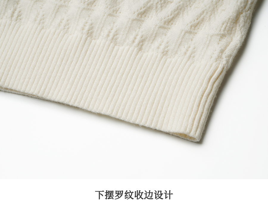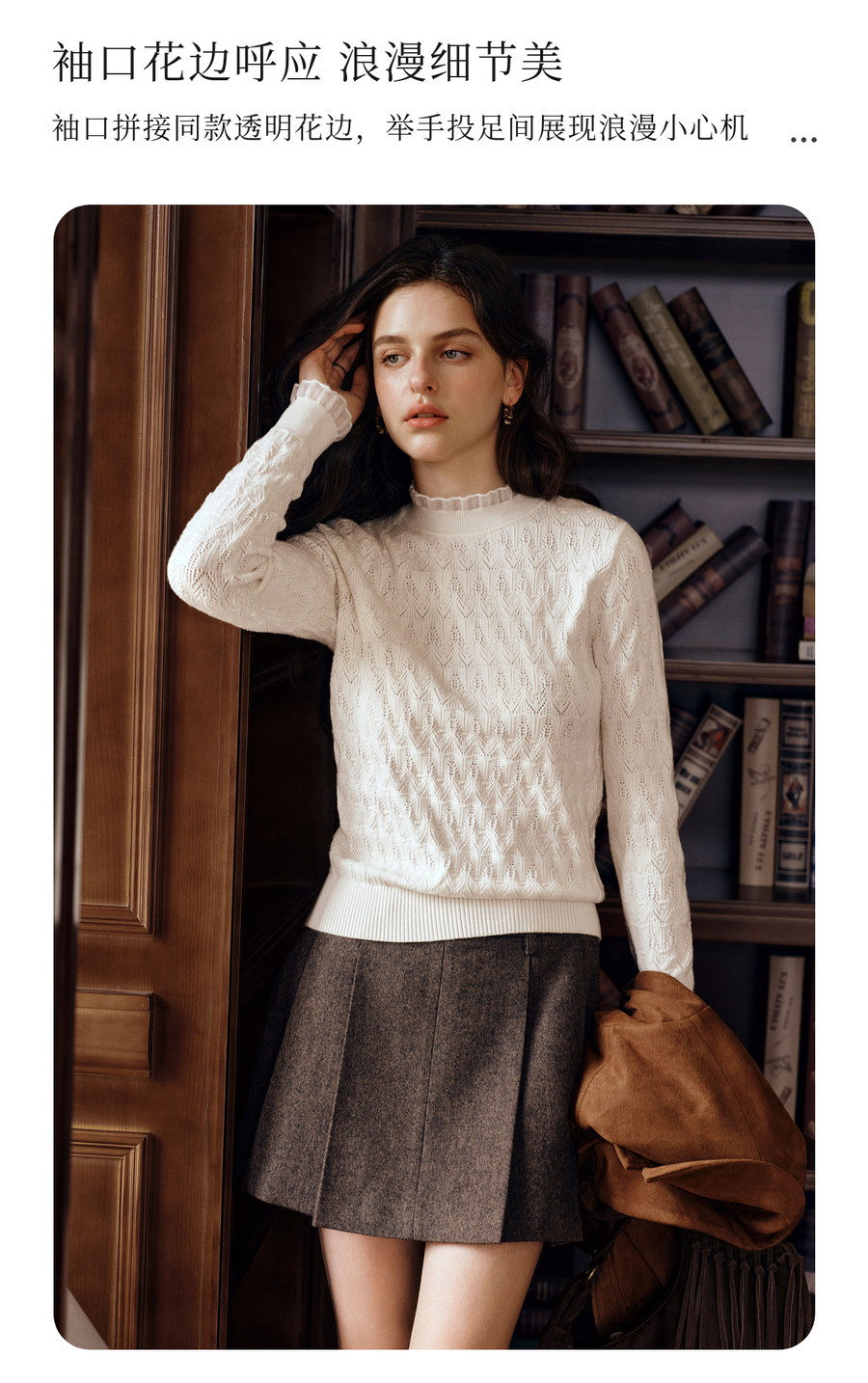OLrain欧芮儿荷叶边镂空织花毛针织套头衫女秋季2025新款长袖上衣