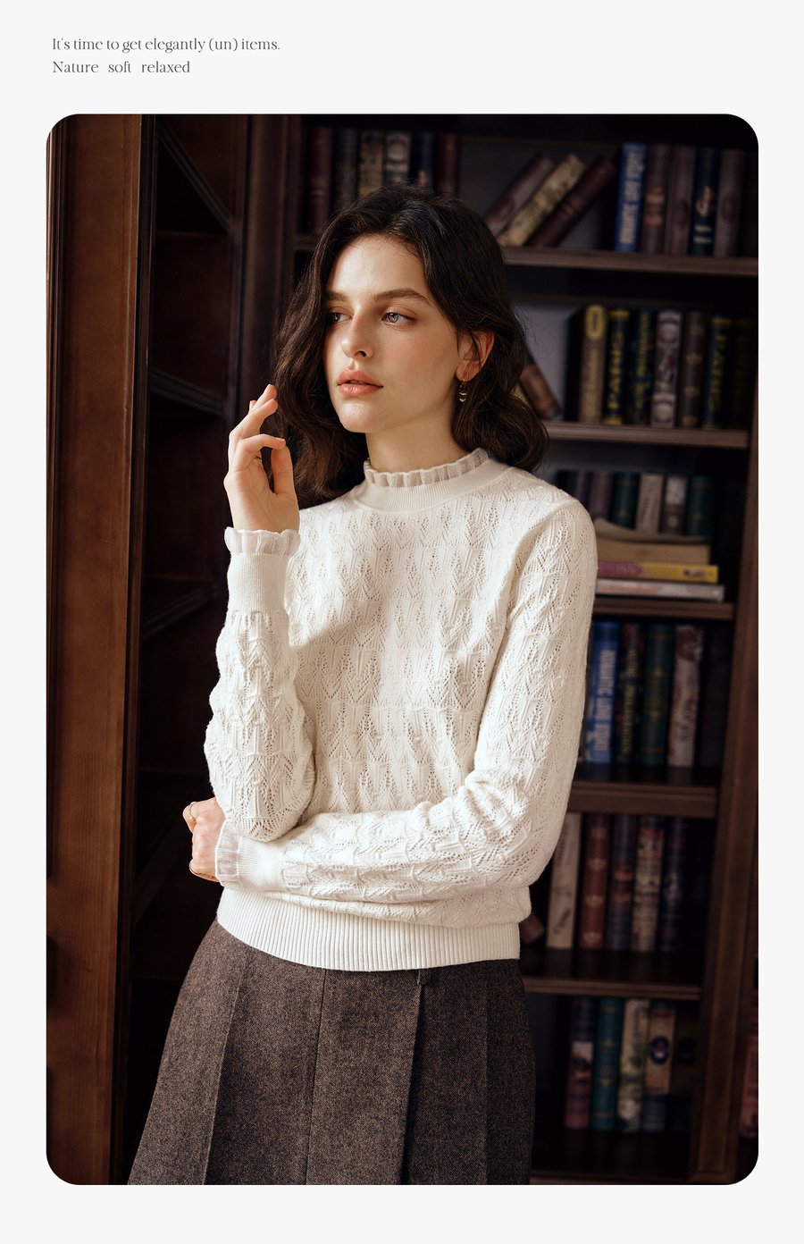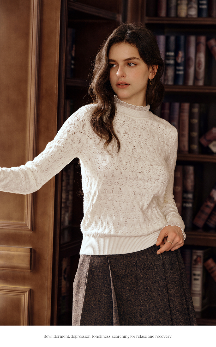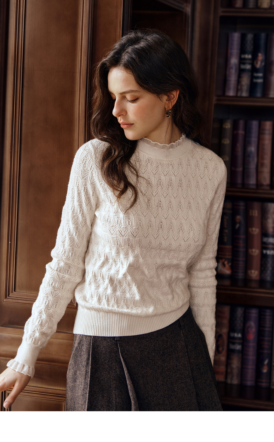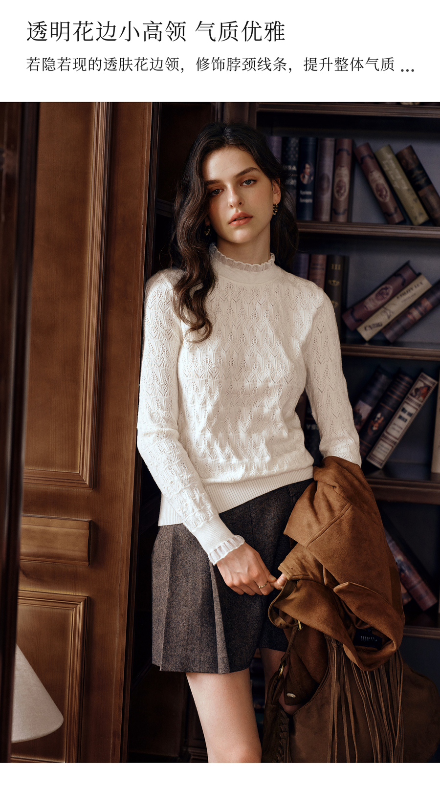 OLrain欧芮儿荷叶边镂空织花毛针织套头衫女秋季2025新款长袖上衣