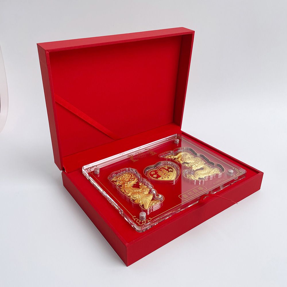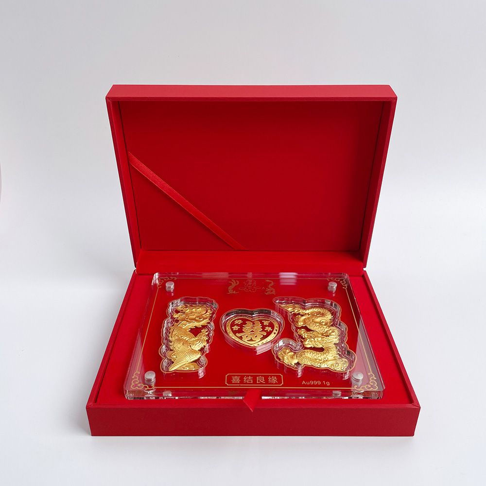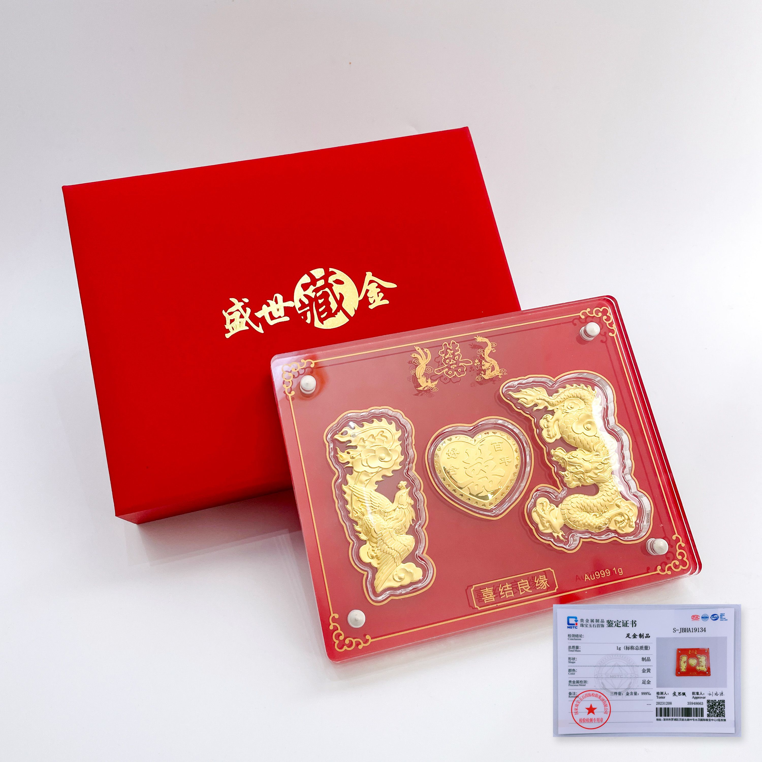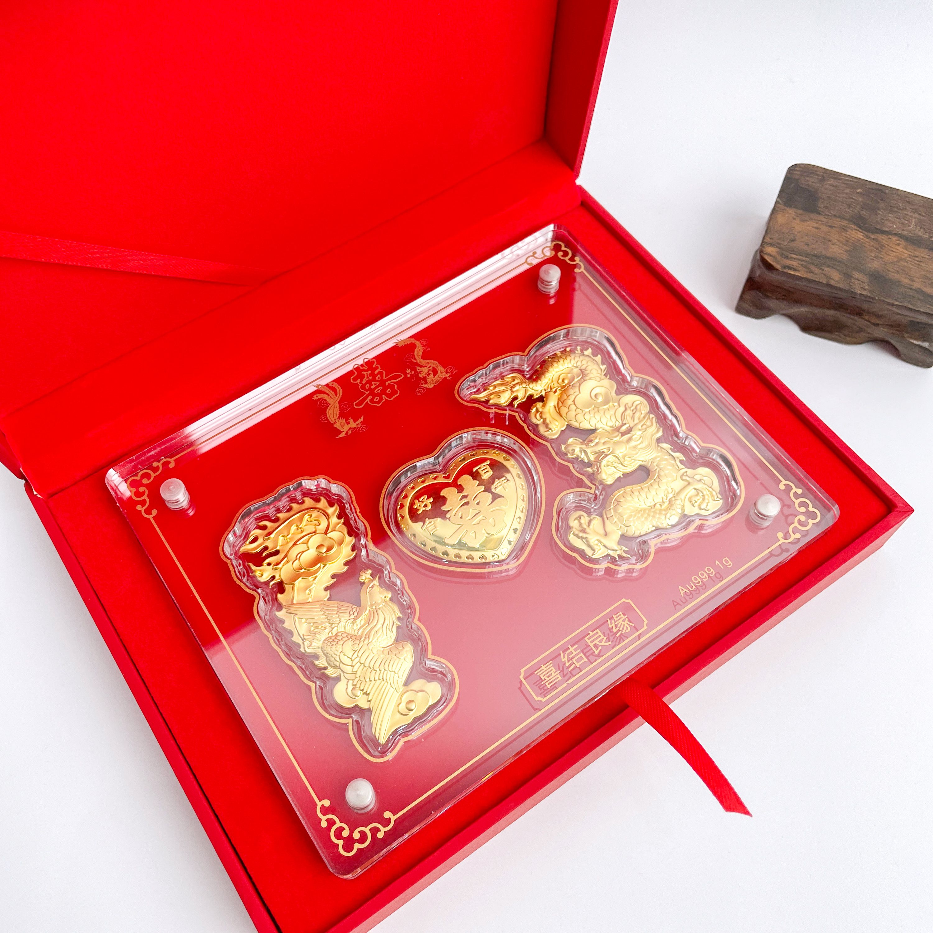 【限时克减150元】足金#婚庆 龙凤双喜摆件礼盒婚庆礼盒陪嫁嫁妆新婚订婚喜结良缘三件套摆件礼盒(配精美包装、NGTC国检证书)(ATBJ00015)预售产品下单后不退款不退货不换货不补差价