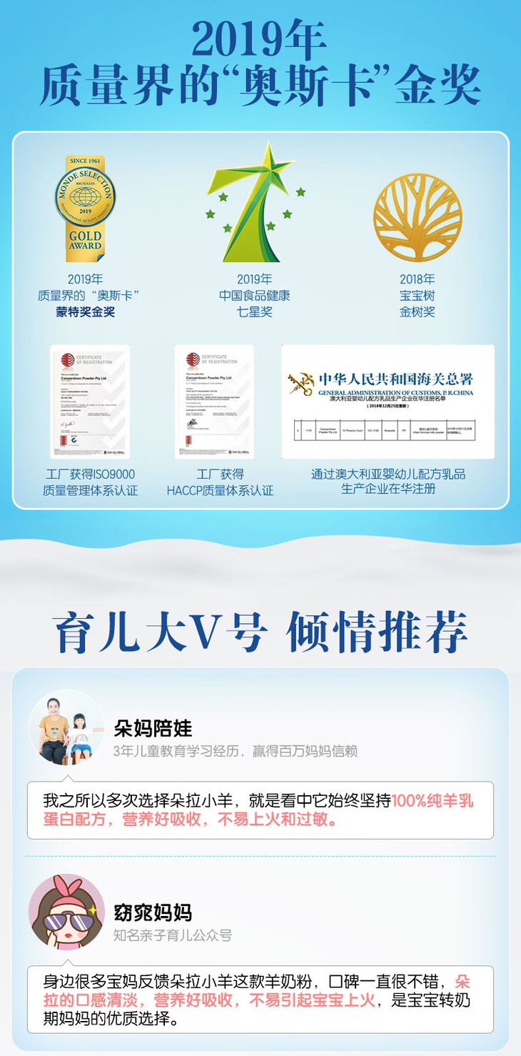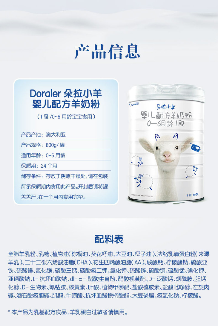 澳洲Doraler朵拉小羊婴幼儿配方羊奶粉1段0-6个月800g(2022年4月)