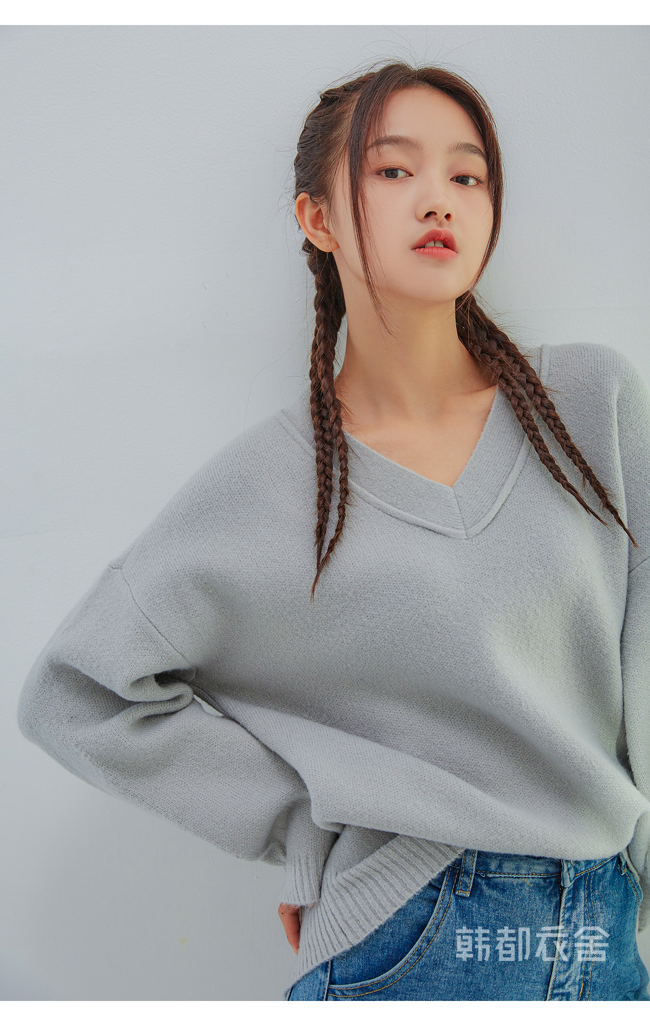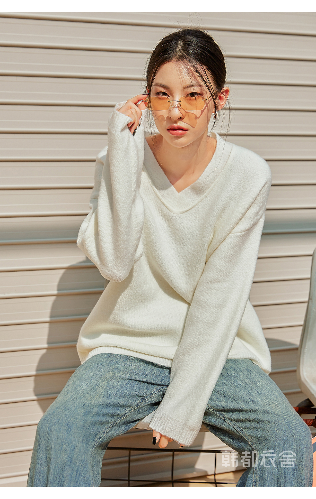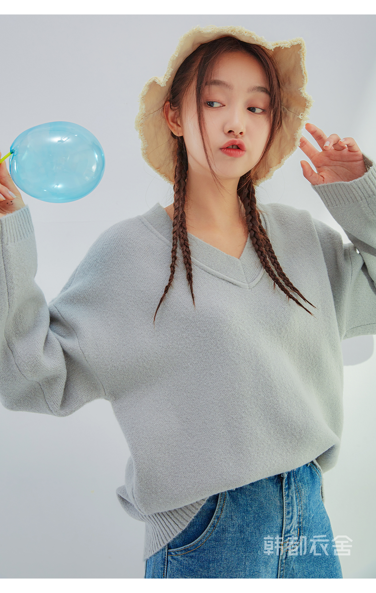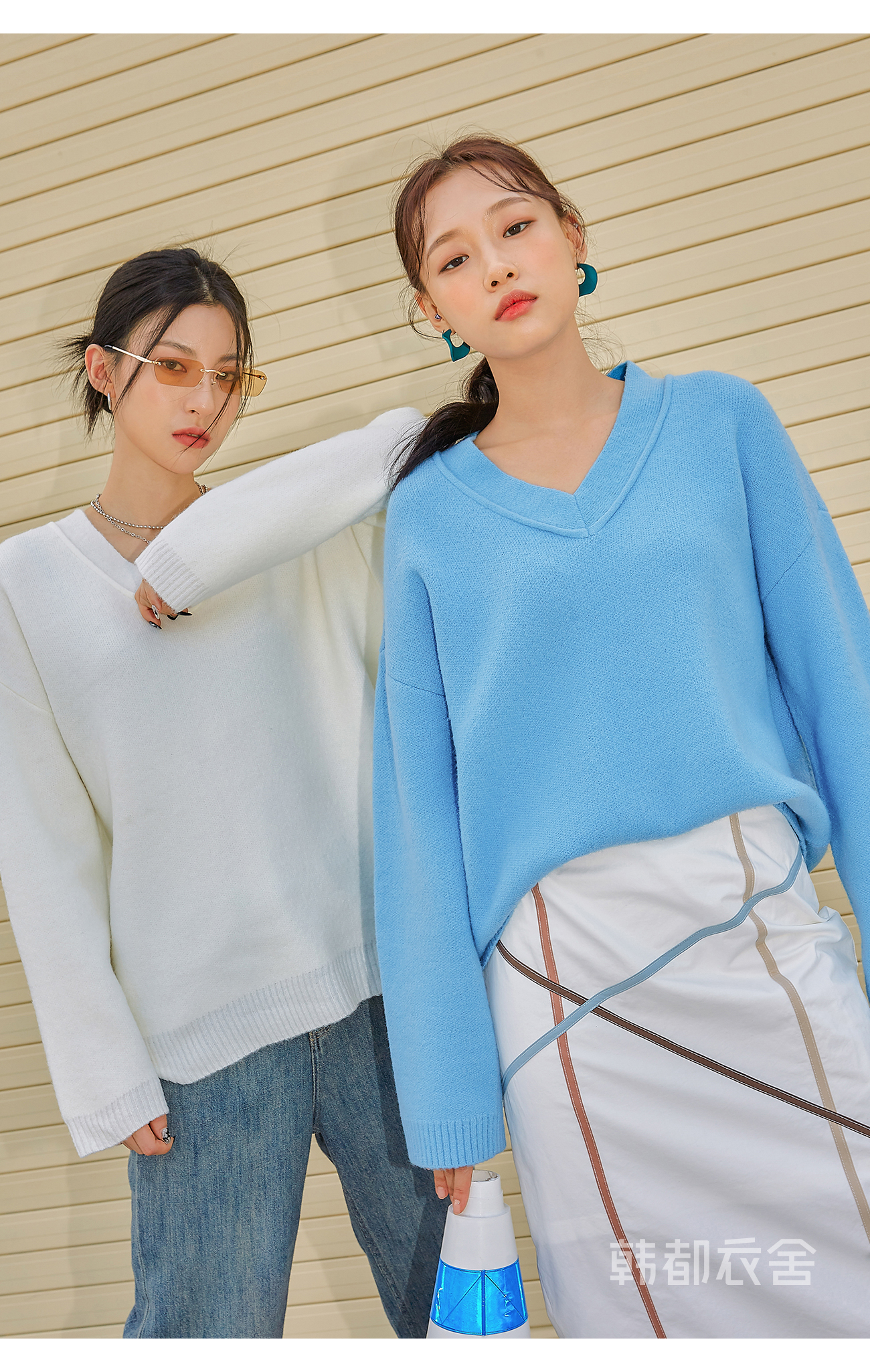 韩都衣舍outlets冬装新款宽松V领毛衣女上衣套头针织衫WZCQ9721