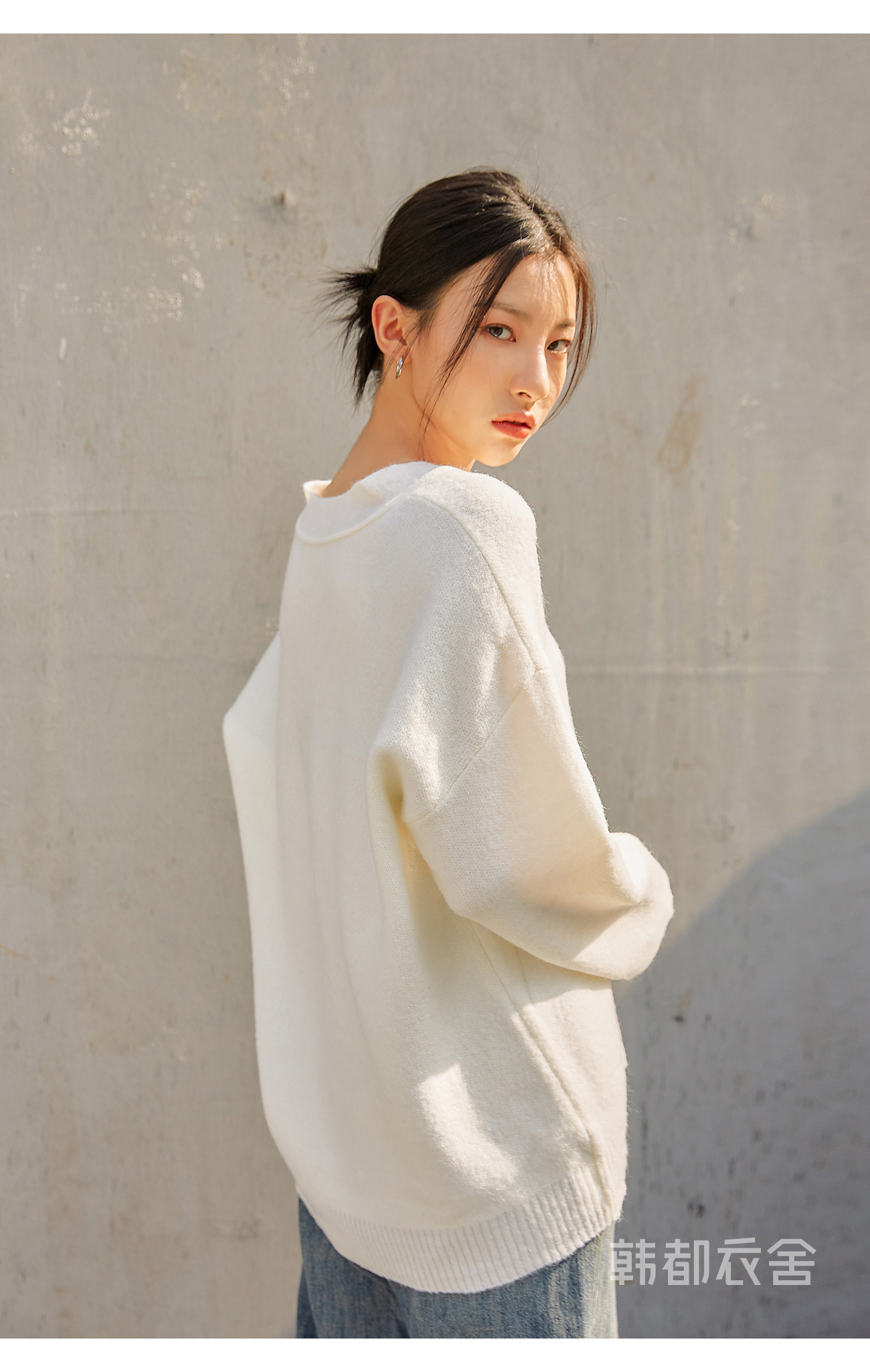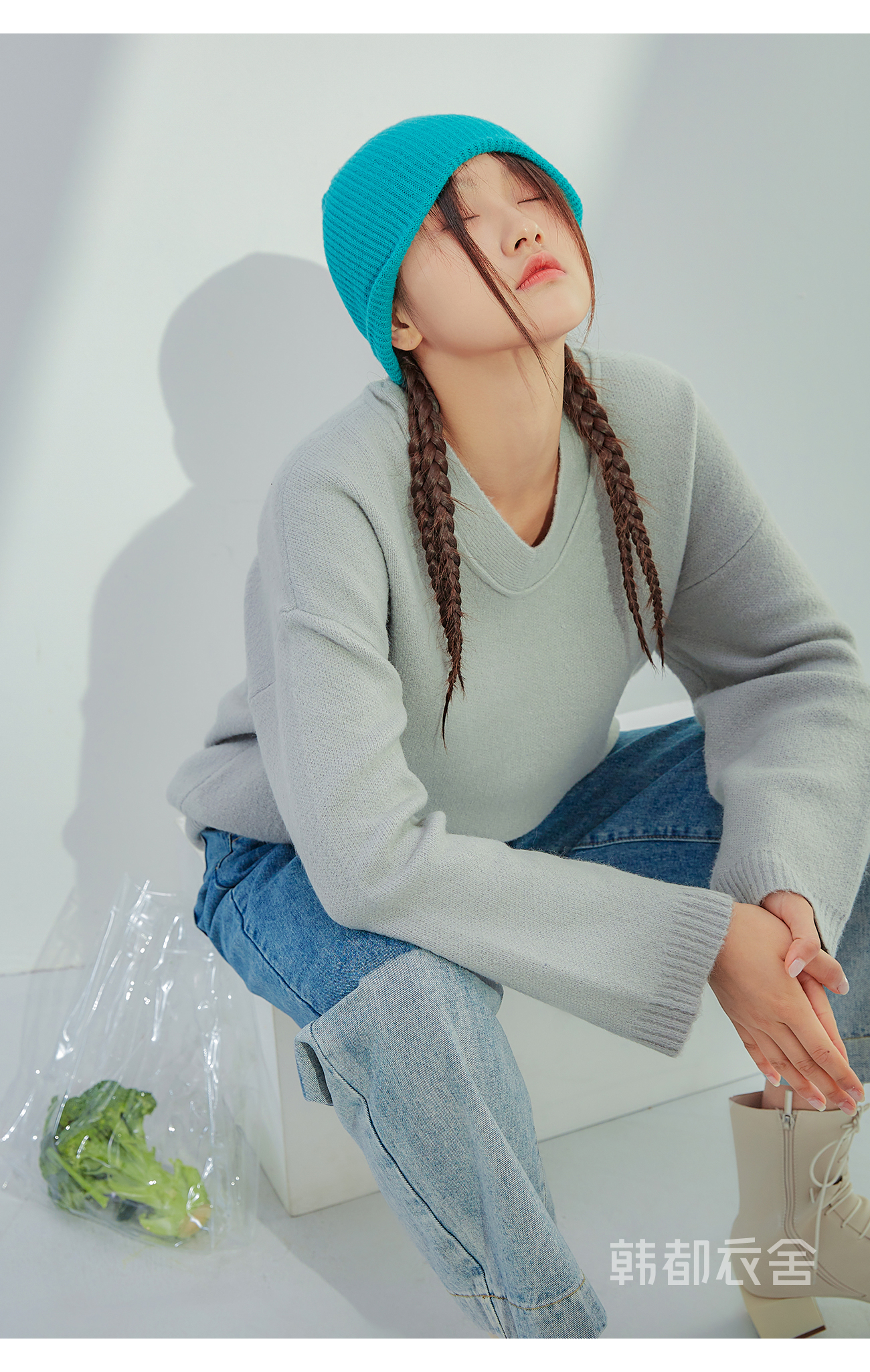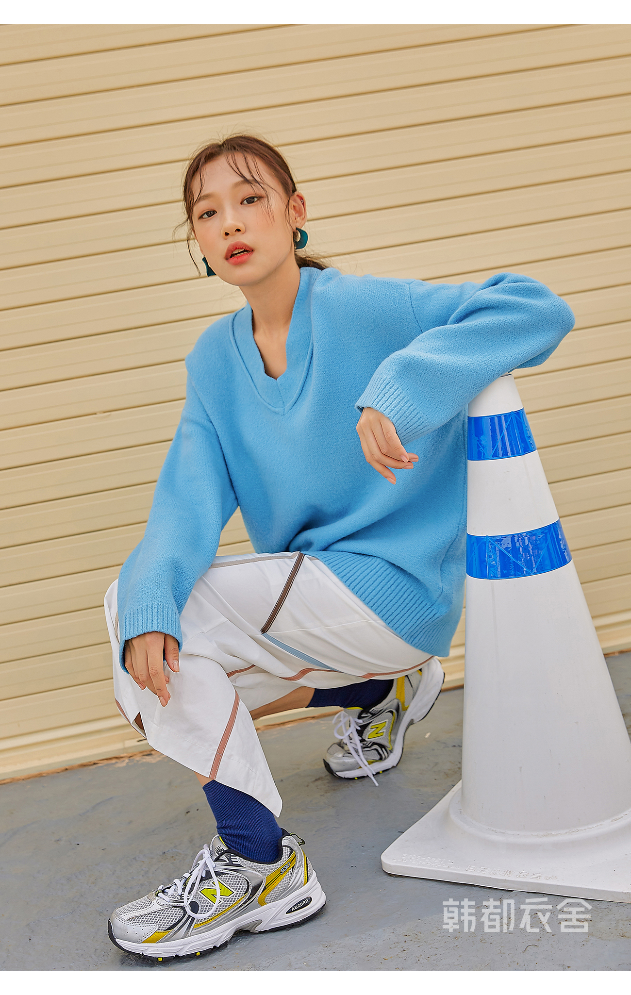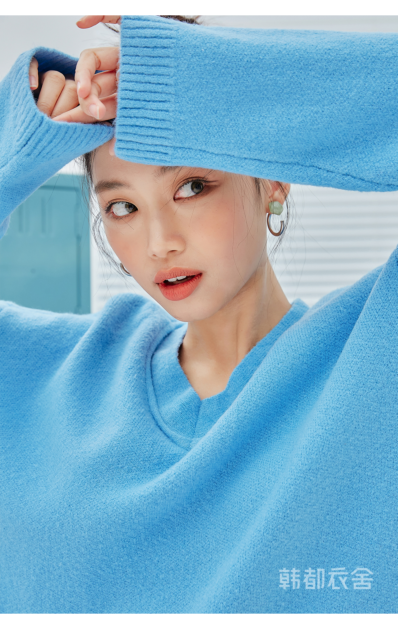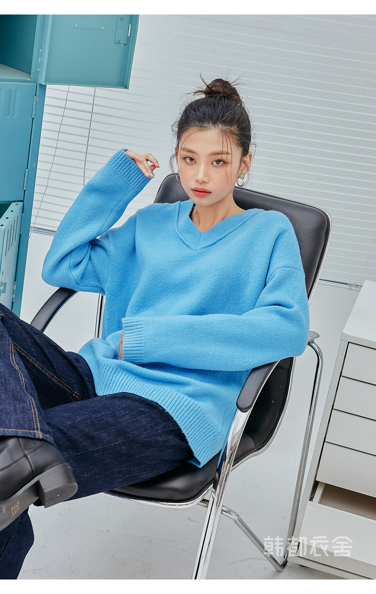 韩都衣舍outlets冬装新款宽松V领毛衣女上衣套头针织衫WZCQ9721
