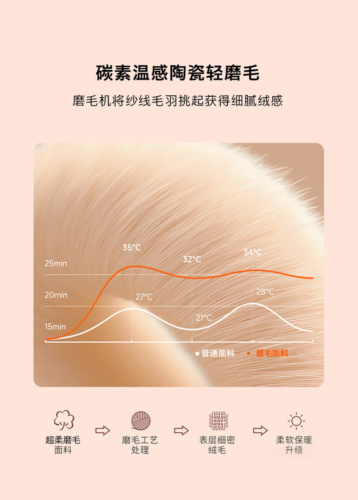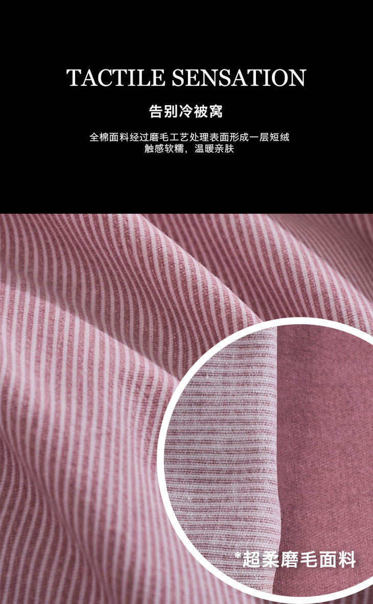 这份羊绒般的糯滑,从不是 “转瞬即逝的精致”—— 碳素磨毛工艺早已为其注入 “持久奢适” 的基因 纤绒被牢牢锁于织物肌理,纵是日常摩挲、机洗翻滚,也不见半分游离絮丝飘飞,更无恼人毛球纠缠织物表面,始终保持洁净细腻的品相。 哪怕历经多次水洗,绒面依旧如初绽般丰盈蓬松,不塌软、不板结,柔润触感丝毫未减 每一次肌肤与之相贴,都仍是初见时 “被暖云裹拥” 的惬意,让 “越用越舒服” 不再是家居想象,而是刻进每一寸面料里的持久奢享