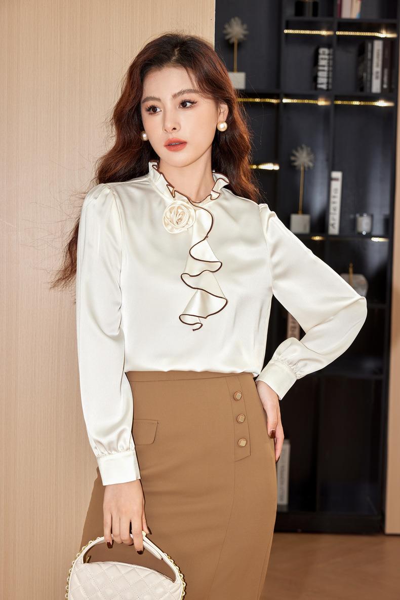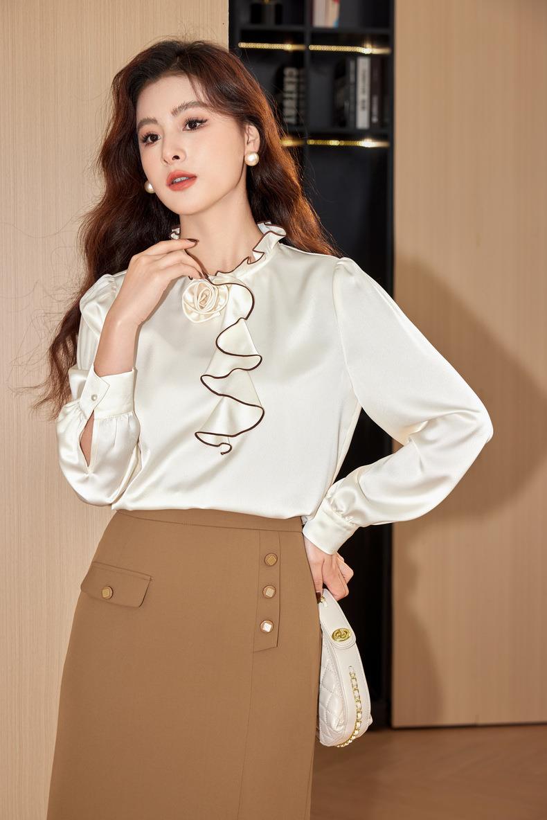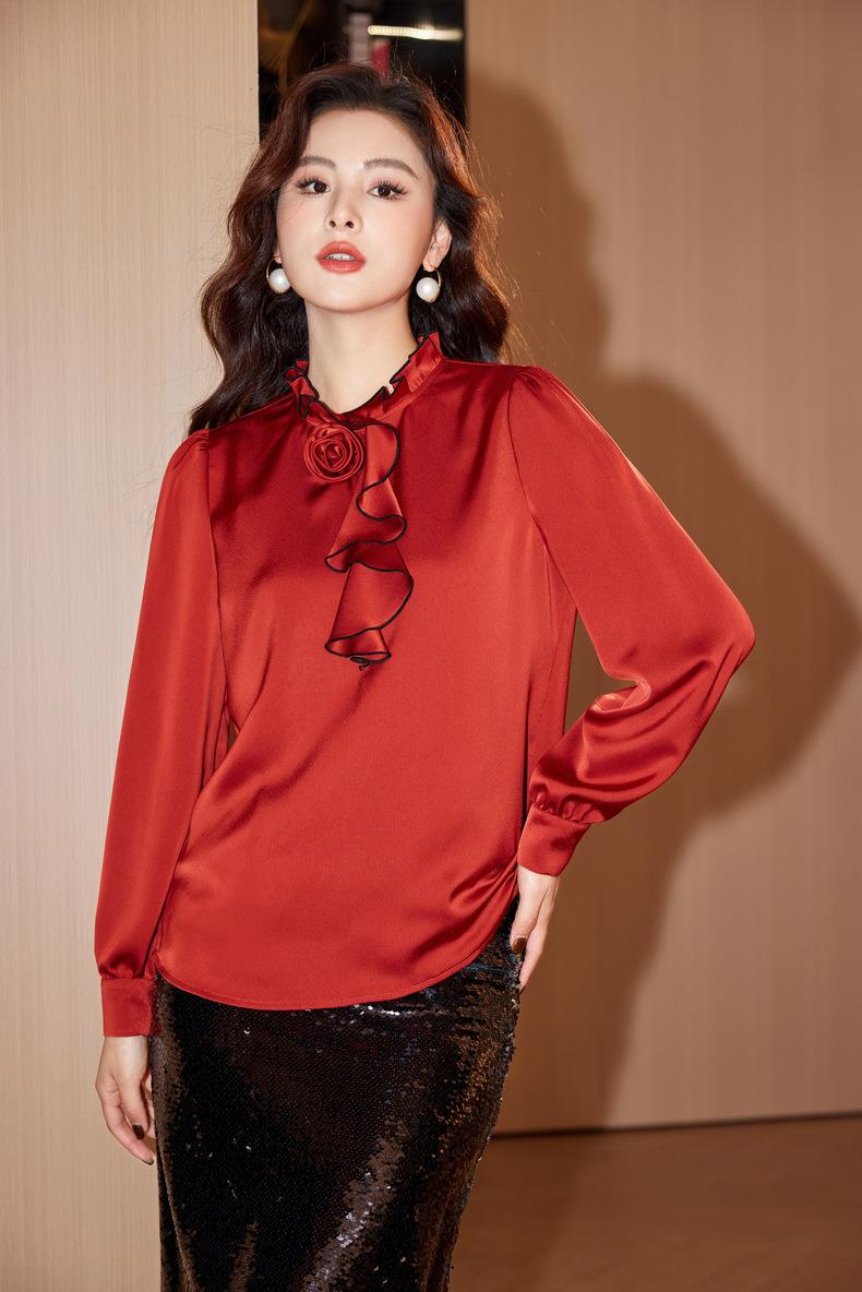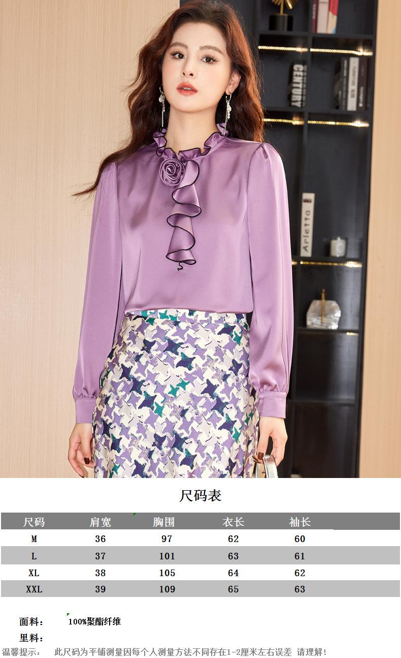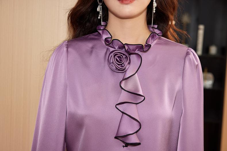 立领缎面雪纺衫女上衣2024春装新款洋气小衫长袖女衬衣8887
