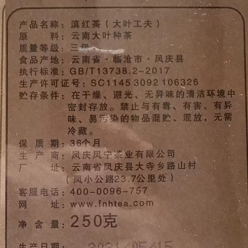 凤宁号【大叶功夫-蜜香】250克 凤庆口粮红茶