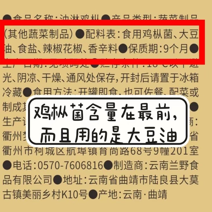 我们的鸡枞菌含量在配料表的最前面,油用的是大豆油,更健康,然后就是家常的食用盐和香辛料,微微辣,用来拌饭、拌面,真的比肉香!