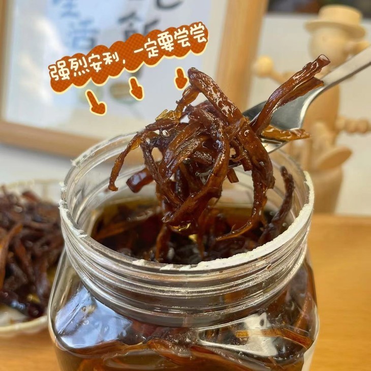 金黄的植物油中浸泡着棕色的鸡枞丝,中间点缀着几段红辣椒,鲜甜丰腴,油香馥郁,又有一点似有若无的辣。这股肥厚的嚼劲,比肉丝更滑嫩。
