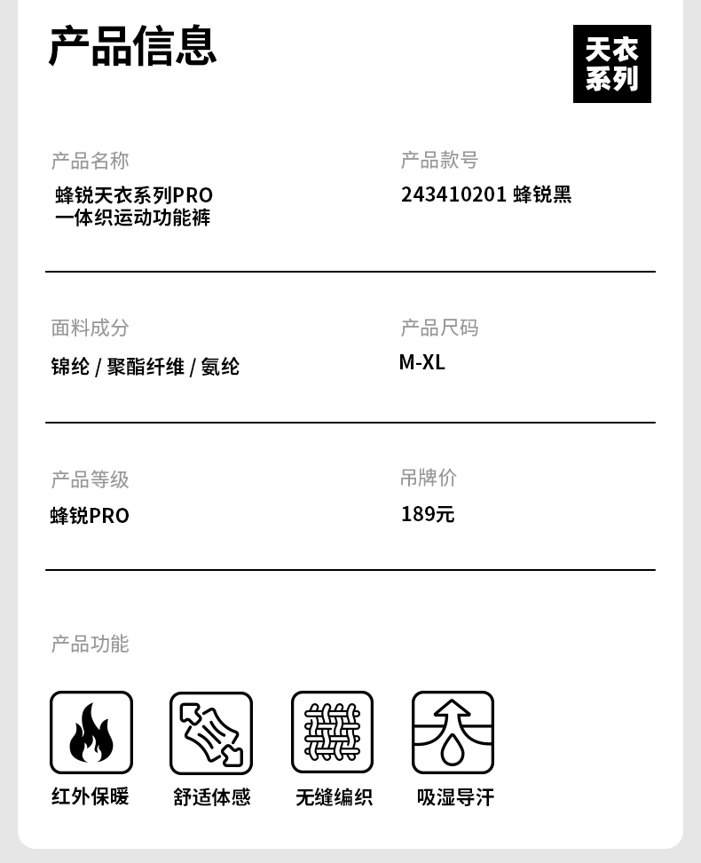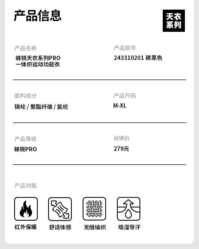 【厚款】蜂锐天衣系列PRO一体织紧身衣运动功能衣2.0成人套装243310201