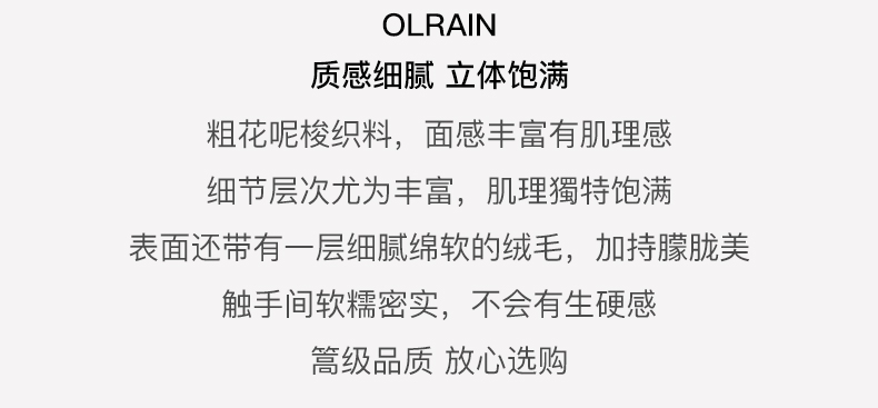 “精致”是欧芮儿olrain品牌文化的核心,欧芮儿认为,精致的女人,不但要外在动人,更要内在迷人,内外兼修,有魅力、有气质、有内涵,自信而不自傲,优雅而不矫揉,自有万种风情而不轻浮,更不故作矜持。