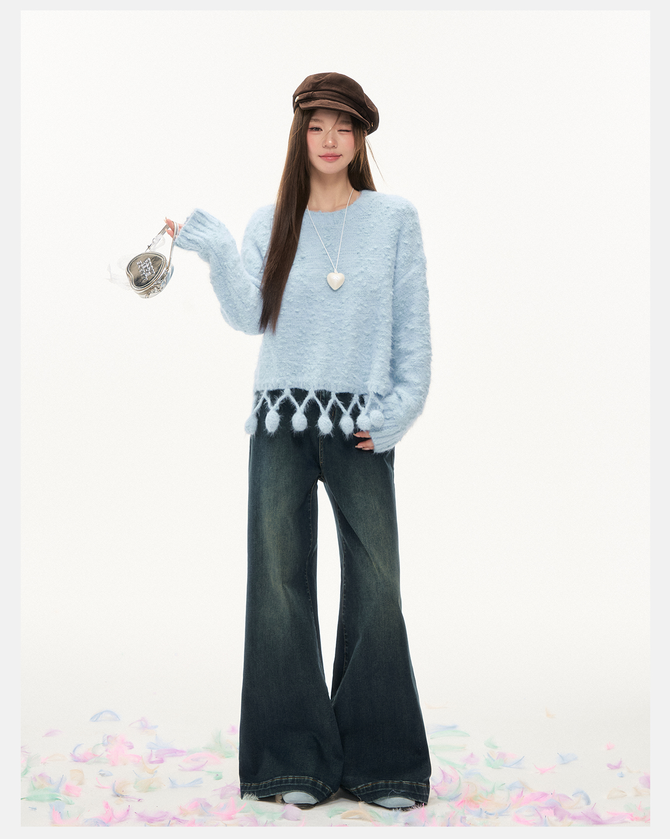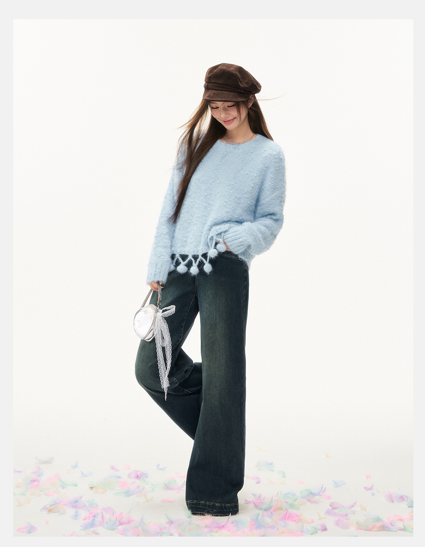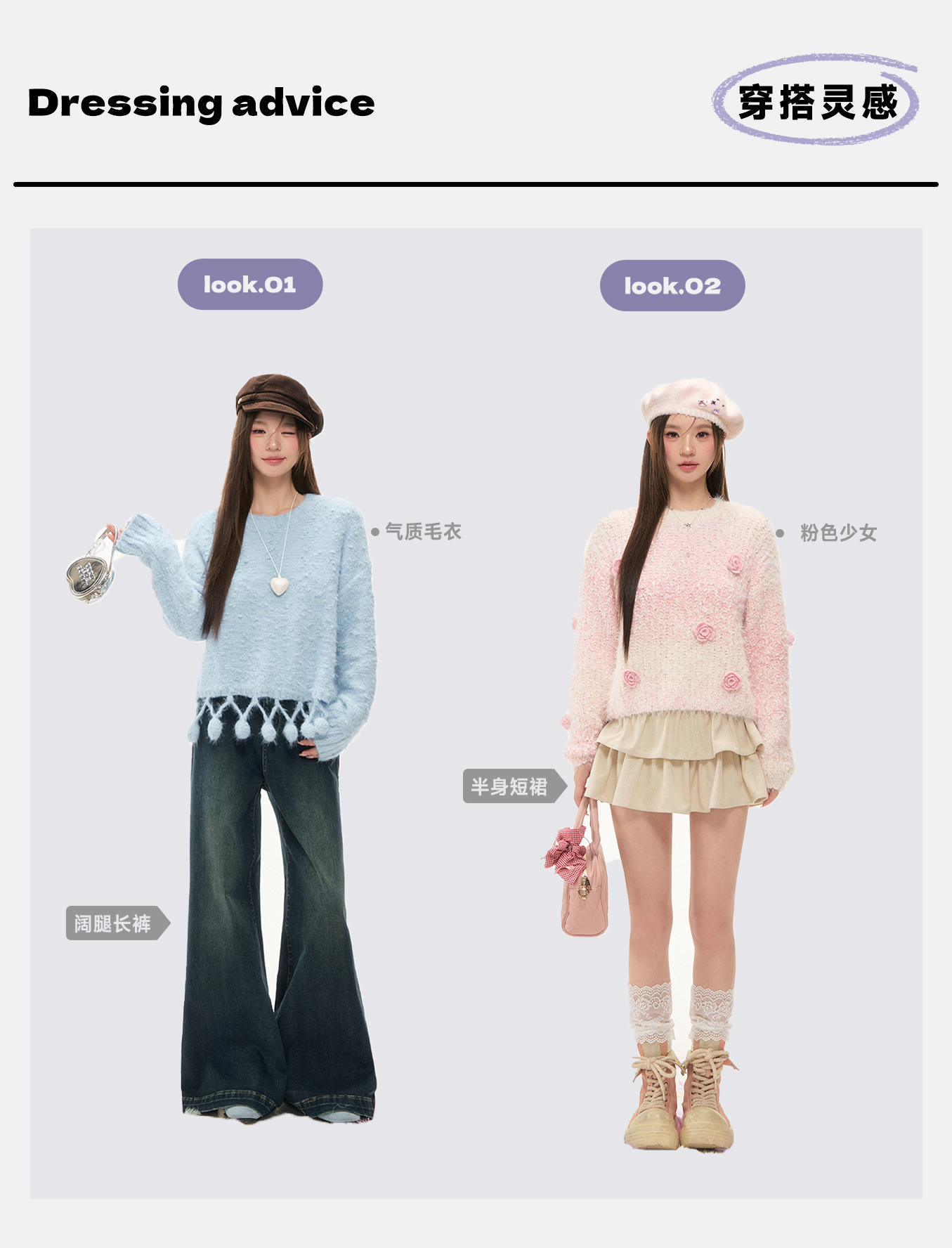 P&X设计师女装2025冬季少女风宽松时尚短款毛衣 825418193 蓝色
