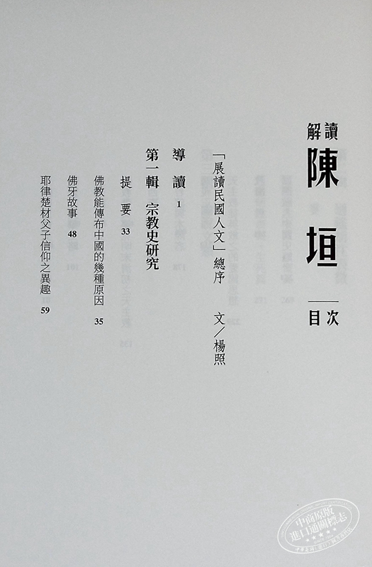 本書選錄三十餘篇陳垣的著述與演講,綜觀他一生中不同階段的轉變。像是陳垣因為具有史家與基*徒的二重身分,研究關懷多為宗教相關的史學題目,以此奠定其「民國四大史家」的重要學術地位;抗戰期間,他更透過《通鑑胡注表微》表明對時局的看法;與子書信中則讓我們看到陳垣既有身為父親的關愛,亦不失學者風範的嚴謹家風。期望讀者能透過主編楊照老師的選文及撰寫的導讀與提要,從陳垣的身上,窺見時代變亂如何塑造學者典範,學者又如何以學、思、行回應時代不安。