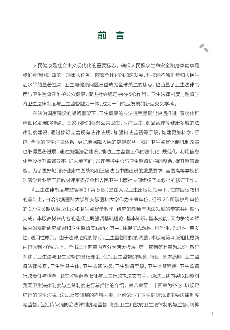 本次修订在内容的选择上既强调基本理论、基本知识、基本技能,又跟踪本领域内的**研究成果,并将卫生体制改革与卫生监督实践纳入其中,力求体现思想性、科学性、先进性、启发性、适用性原则。内容结合数字技术对社会治理的支撑作用,涵盖卫生法的基础理论和行政处罚及行政救济制度;卫生监督的作用、分类及效力;卫生监督法律关系及主体,卫生监督的依据、手段、程序、责任等;现行公共卫生领域已颁布的传染病防治法、国境卫生检疫法、食品卫生法等卫生法律法规,及卫生行政执法文书、典型的卫生监督案例。