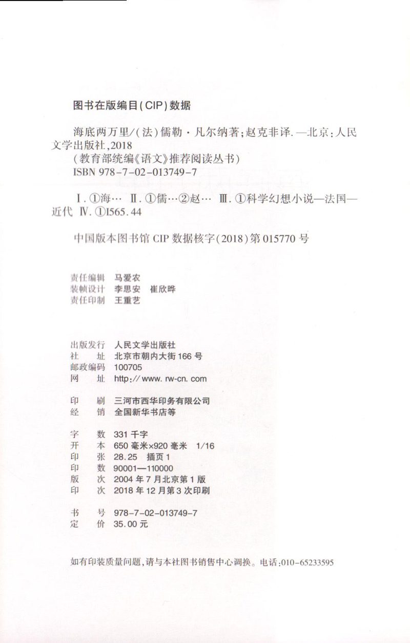 海底两万里凡尔纳七年级下册正版原著人民文学出版社初中生7年级下配套阅读无障碍阅读青少年统编语文教材配套阅读正版图书籍