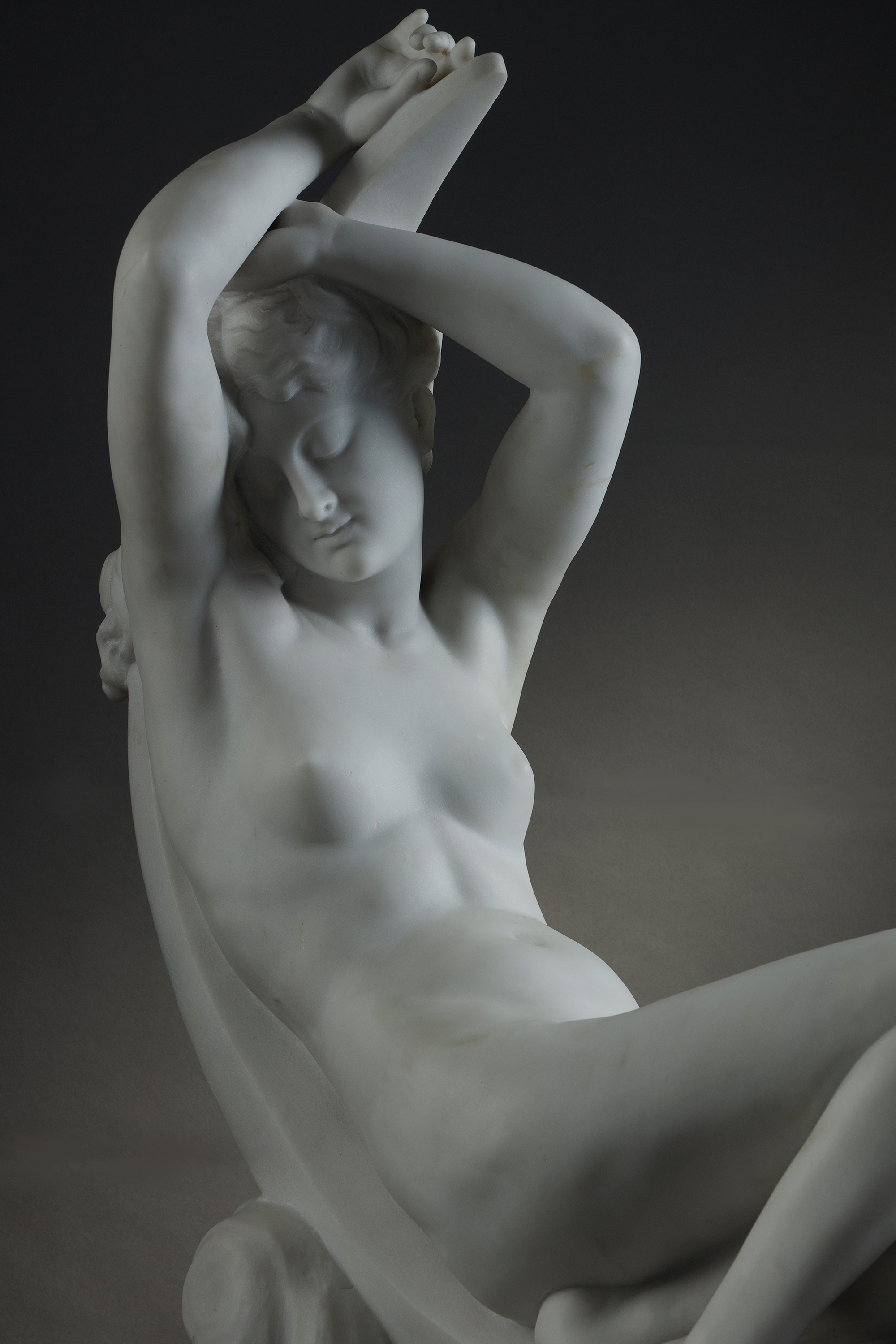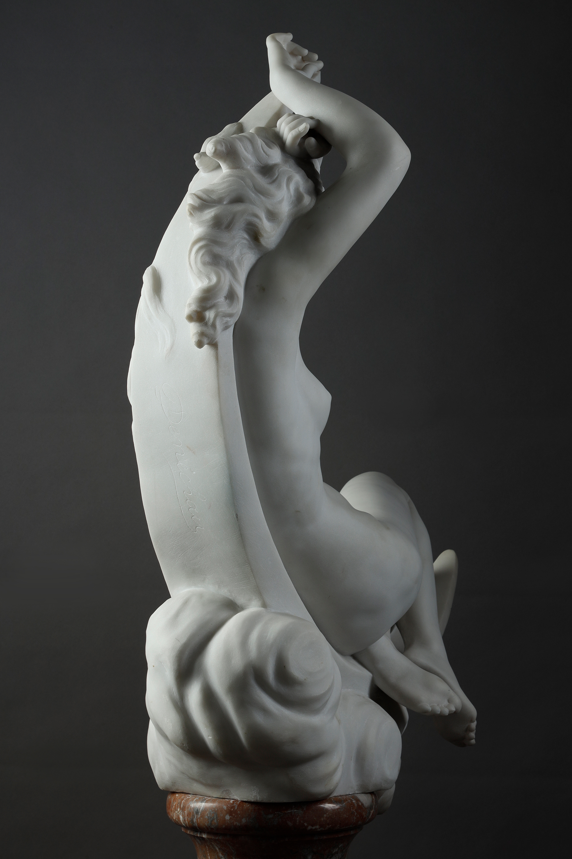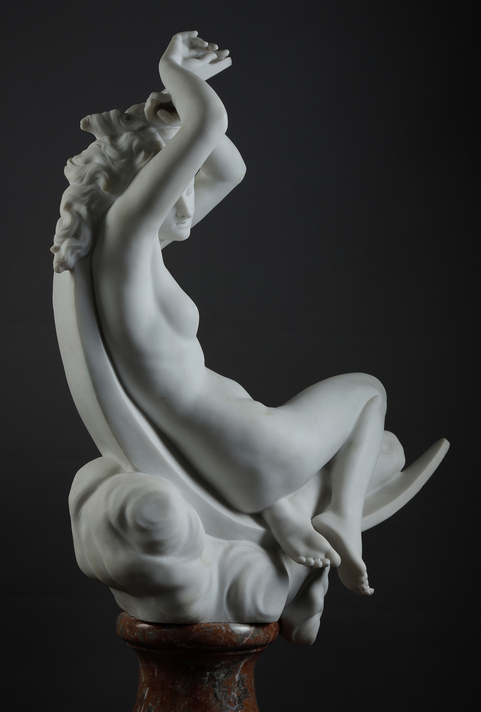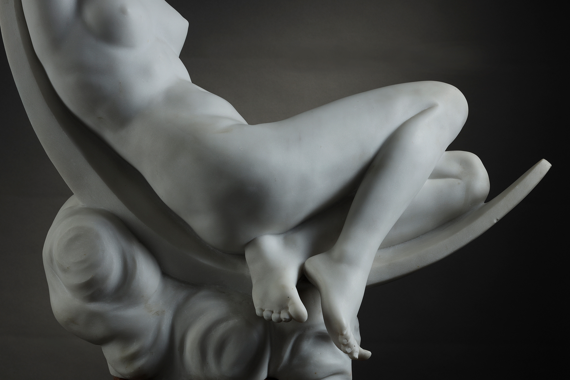 19世纪法国雕塑家Séraphin Denécheau签名创作出品大理石雕塑作品《狄安娜斜倚新月之上》