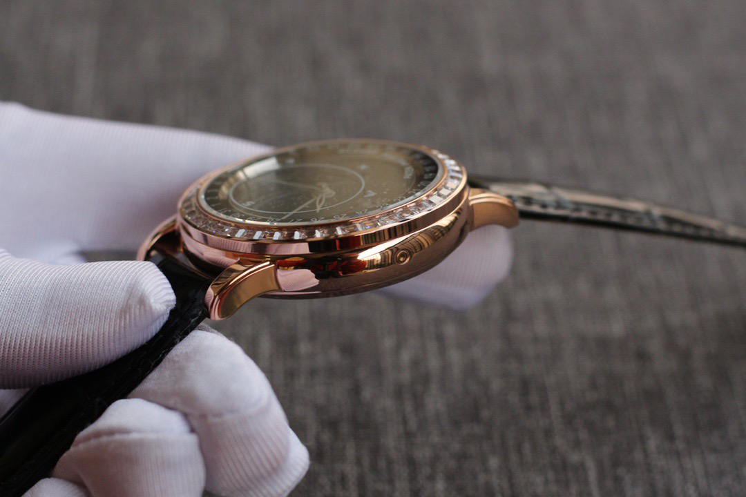YL百达翡丽 超级复杂功能计时系列 星空6104天月款日内瓦苍穹系列,你可想象把星空佩戴在腕上吗?这款星空腕表独具特别星象功能,蓝色圆表盘上就能欣赏日内瓦苍穹图,还有金色月球运行轨迹,熬时20个月 采用进口9015改造而成的珍珠陀,和正品一样机芯,表盘上的月亮会根据天空的月亮月满圆 月蚀弯的情况自动变化 表壳前后玻璃采用先进技术处理让玻璃折射光提高,让表盘看起来更加通透 似乎没有玻璃的感觉 5字位把头调星空盘转动。本厂壳身百.达翡.丽花纹 花重金采cnc深雕刻 立体感凹凸感 超强。升级了24小时自转的星空