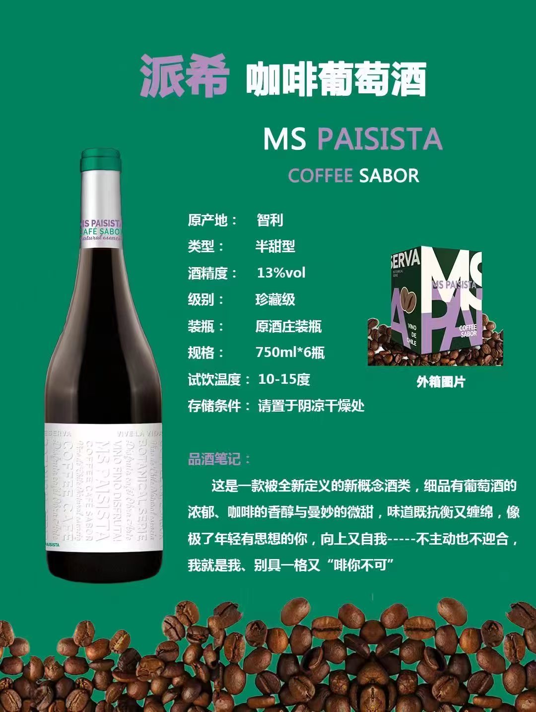 智利珍藏级咖啡葡萄酒750ml六支装