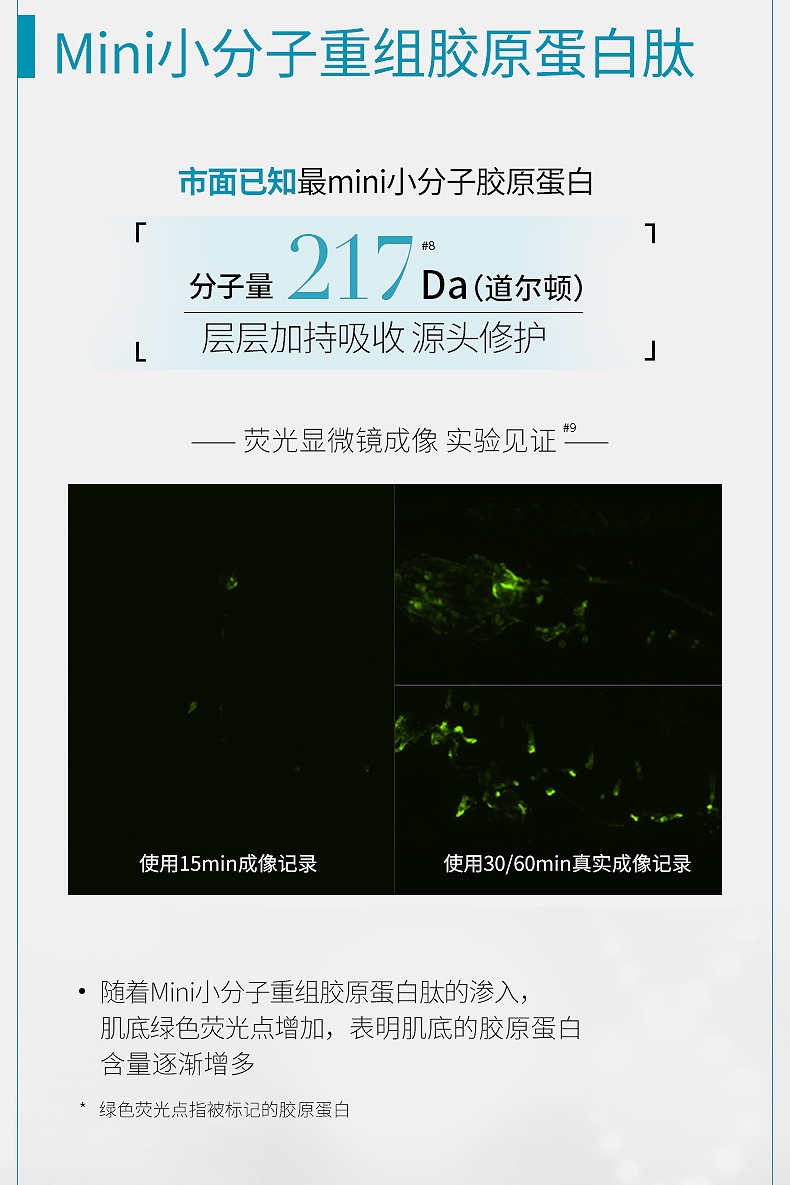 添加了专研成分 Human-like重组胶原蛋白里面有mini小分子重组胶原蛋白肽能够从内到外修护脆弱的皮肤屏障!