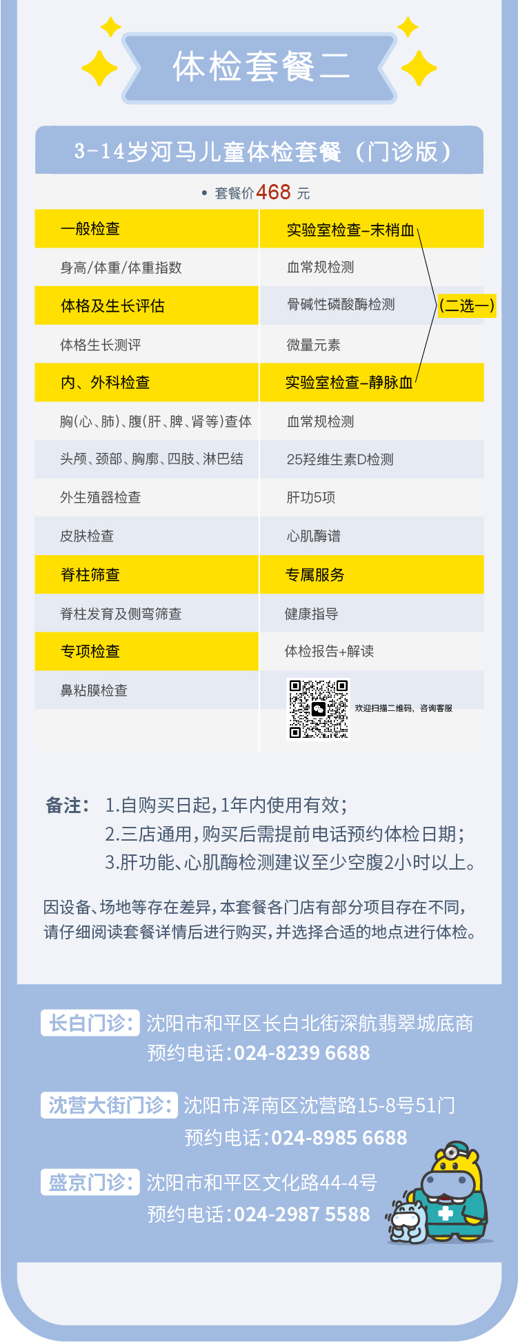 (6个月-14岁)门诊版-河马儿童体检套餐 (需提前1周预约自提时间 预约电话024-86116888 )(河马)