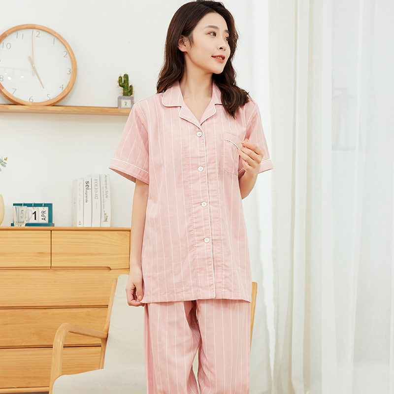 【竖条纹双层纱家居服】双层纱短袖家居服短袖全棉男女情侣竖条纹短袖长裤