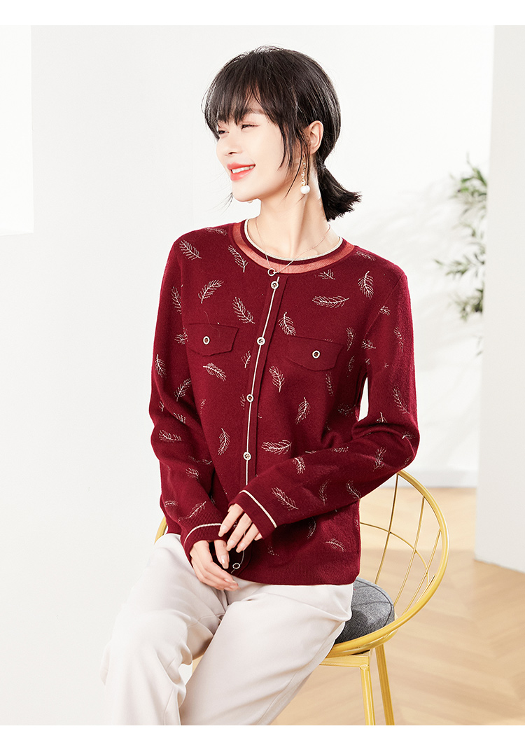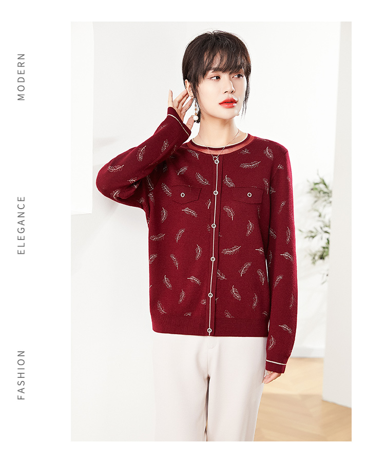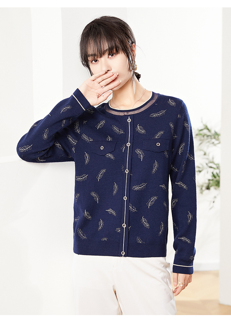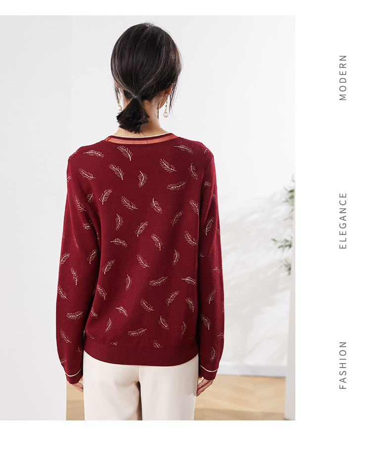 佐尔美2022秋季新款 蓝色红色羽毛图案气质羊毛衫女E14MS02