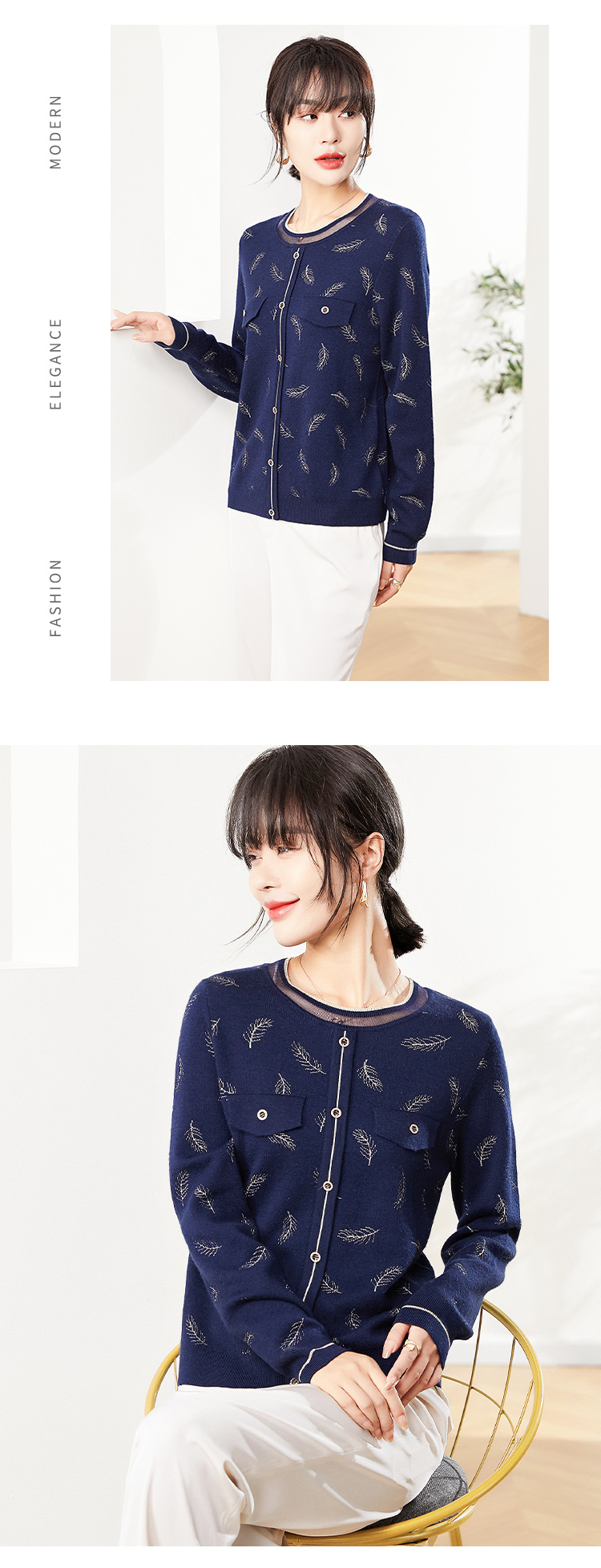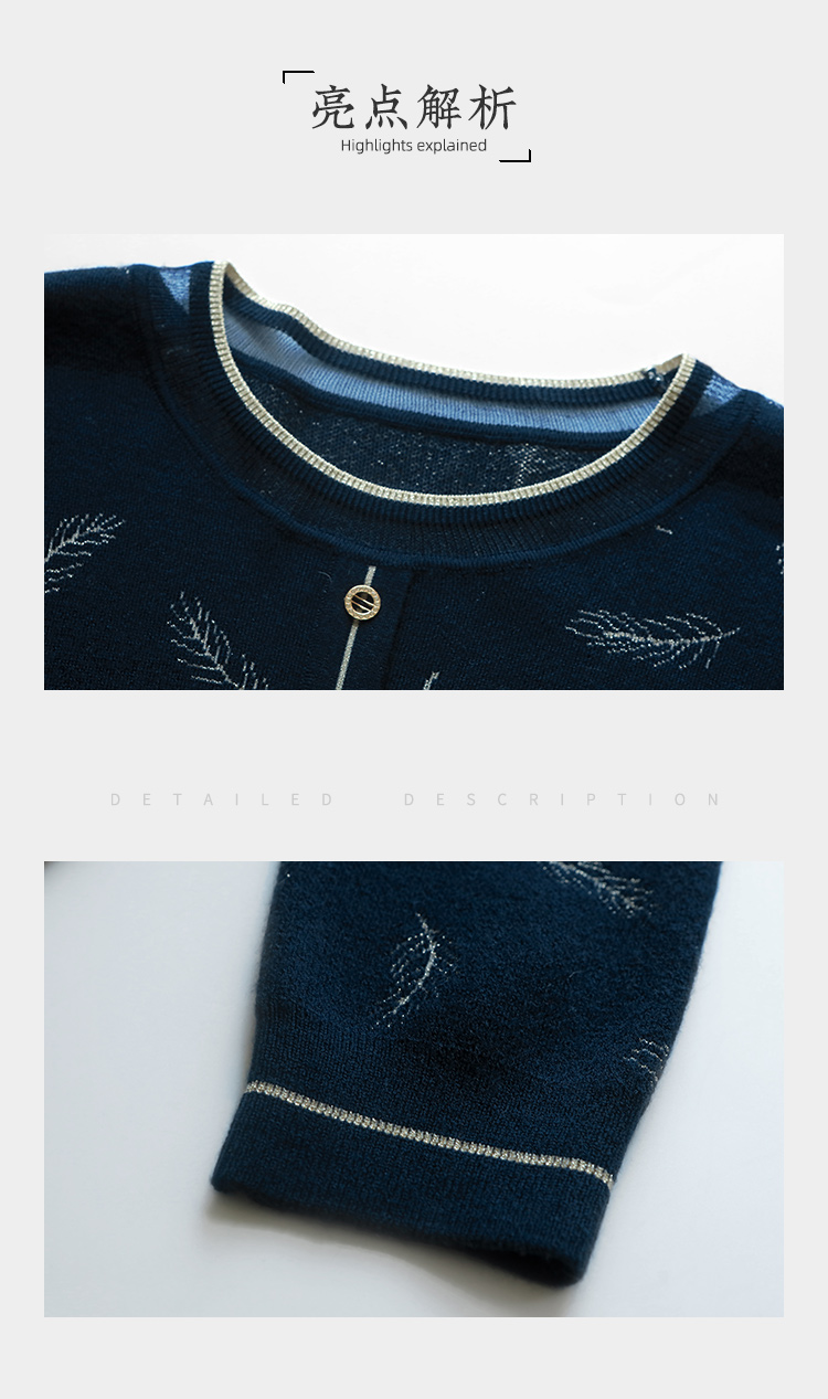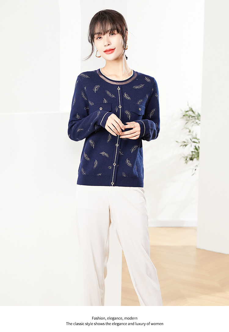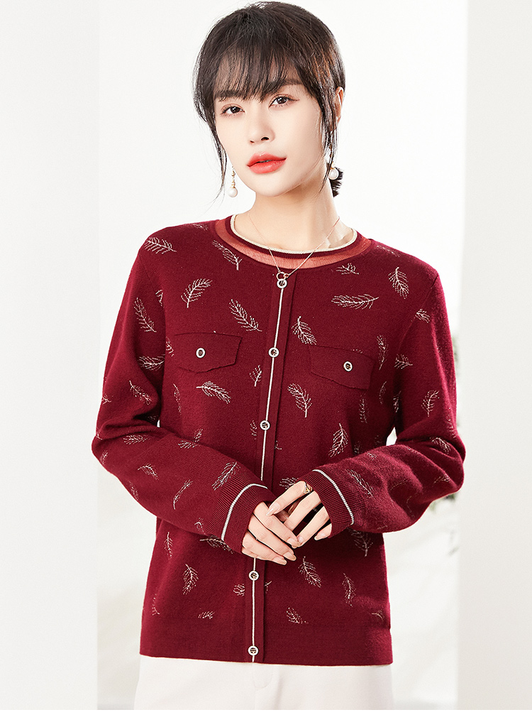 佐尔美2022秋季新款 蓝色红色羽毛图案气质羊毛衫女E14MS02