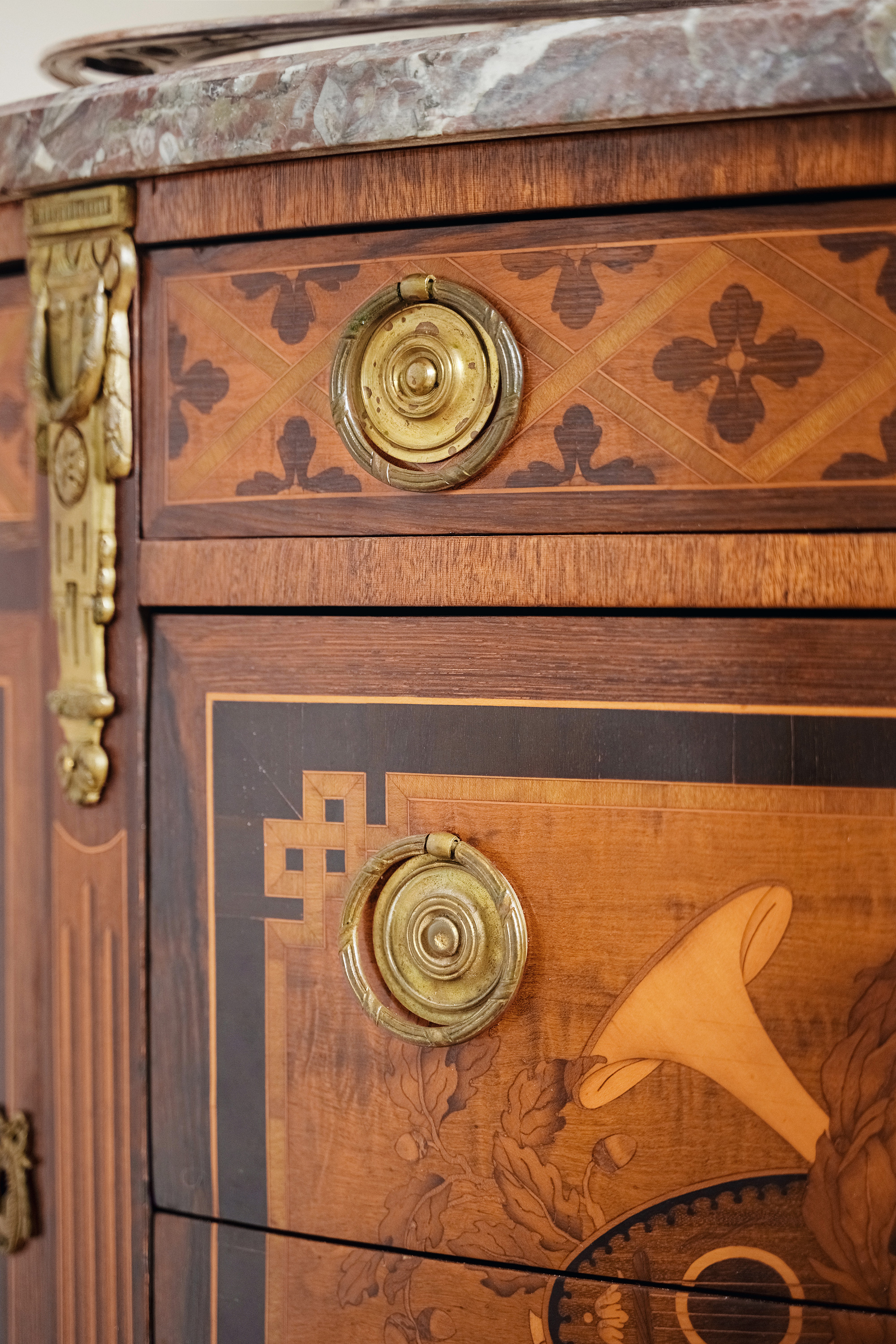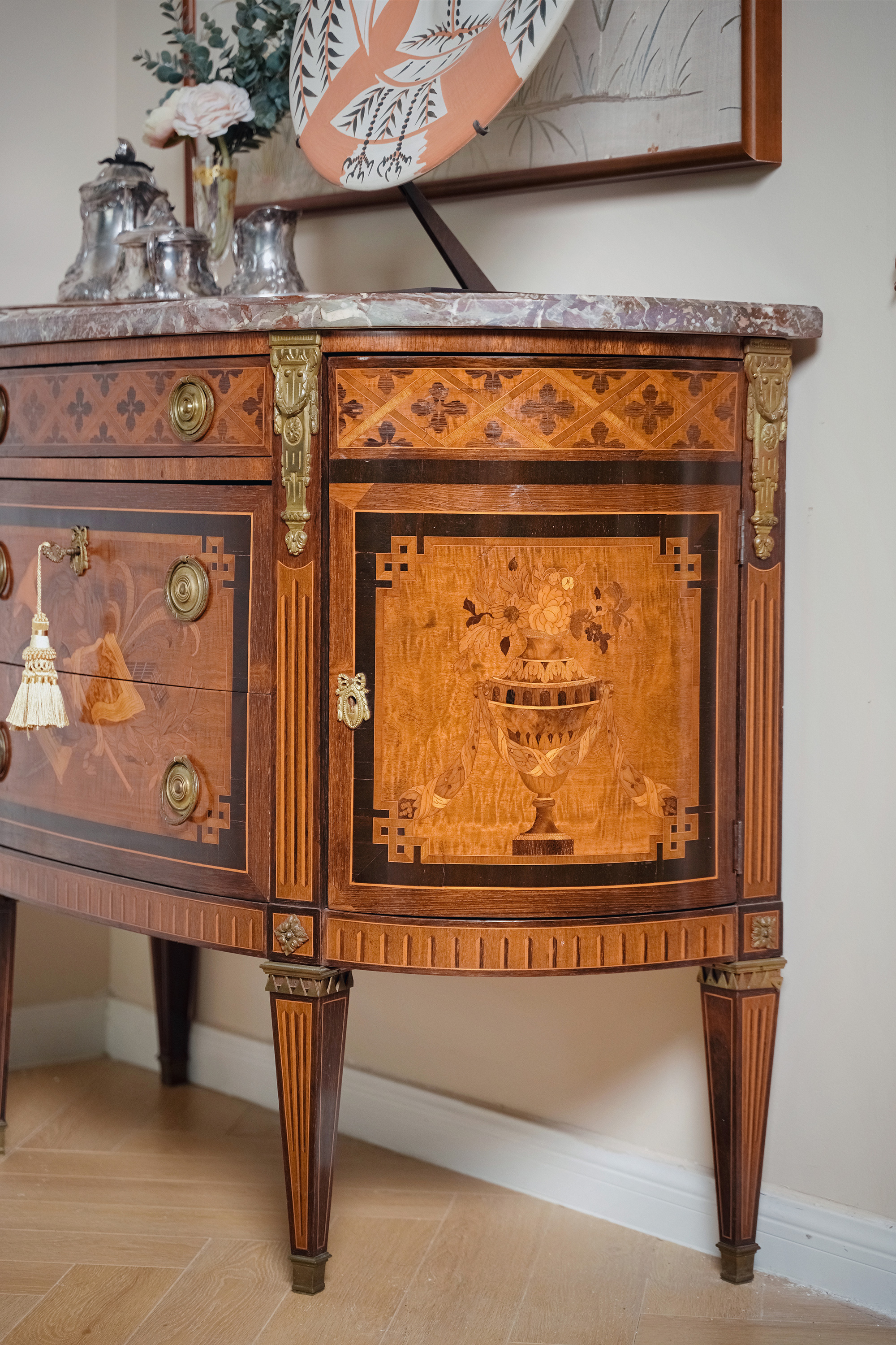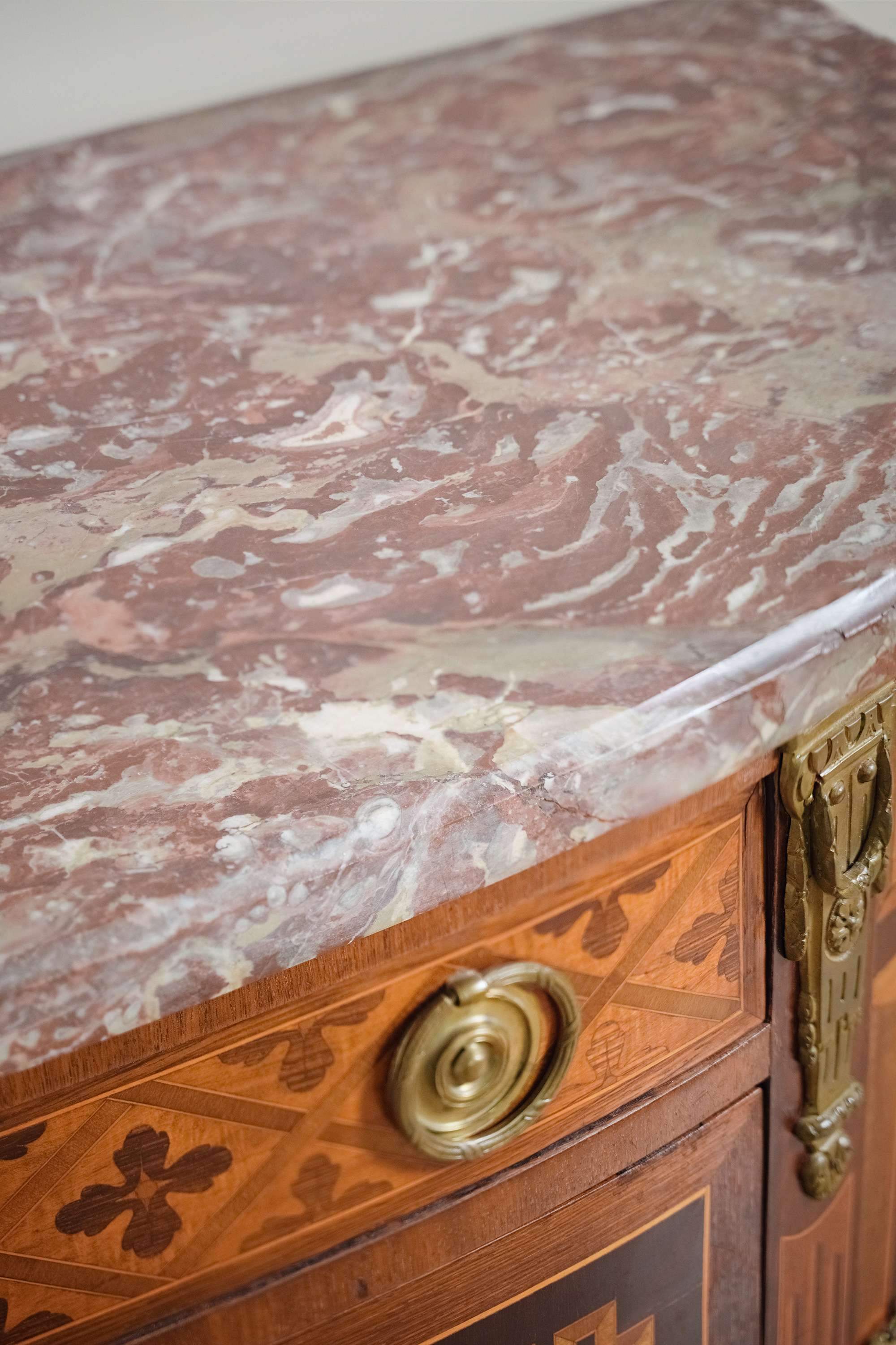 19世纪末法国出品路易十六风格铜鎏金装饰大理石面细木镶嵌边柜
