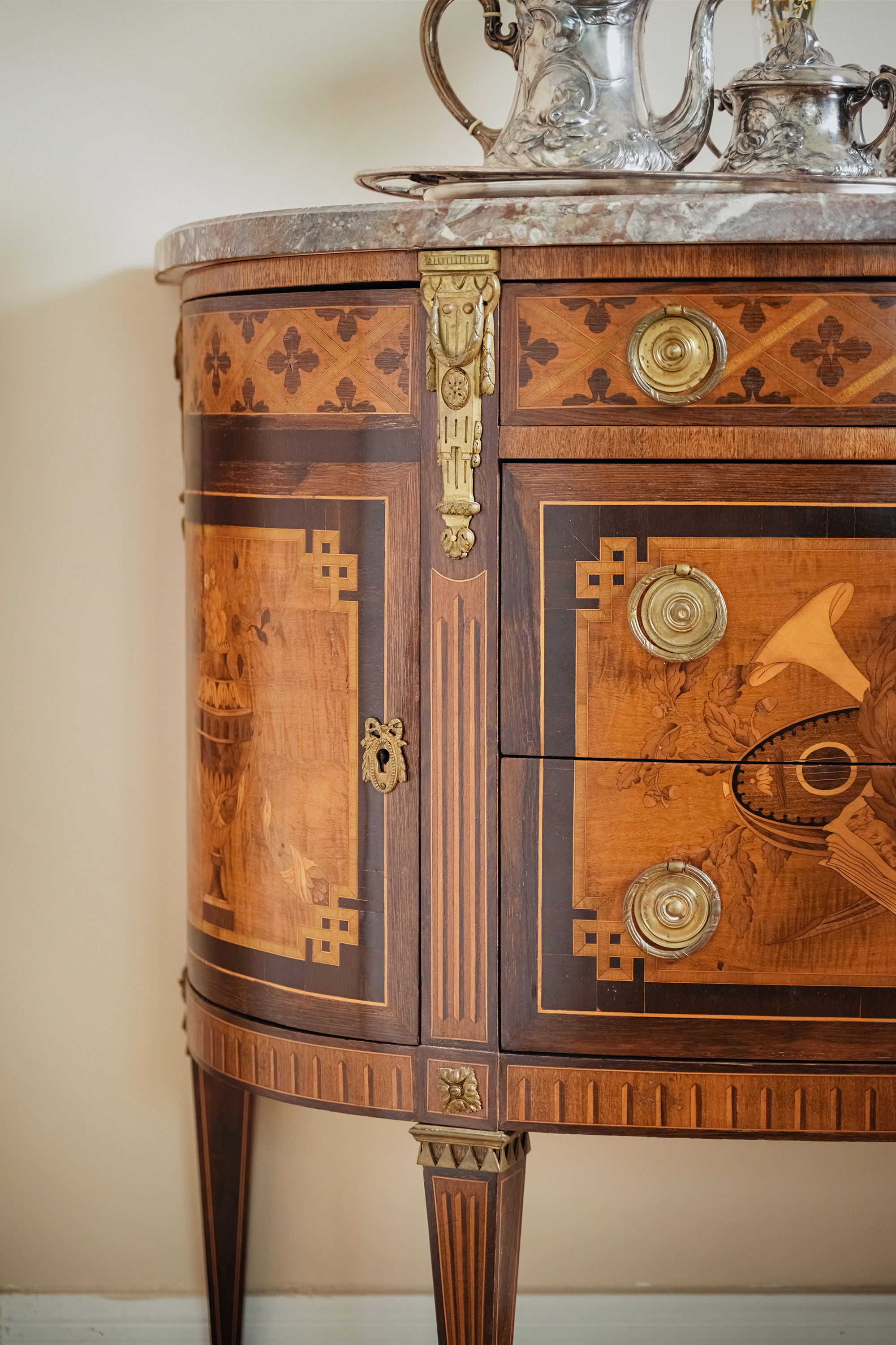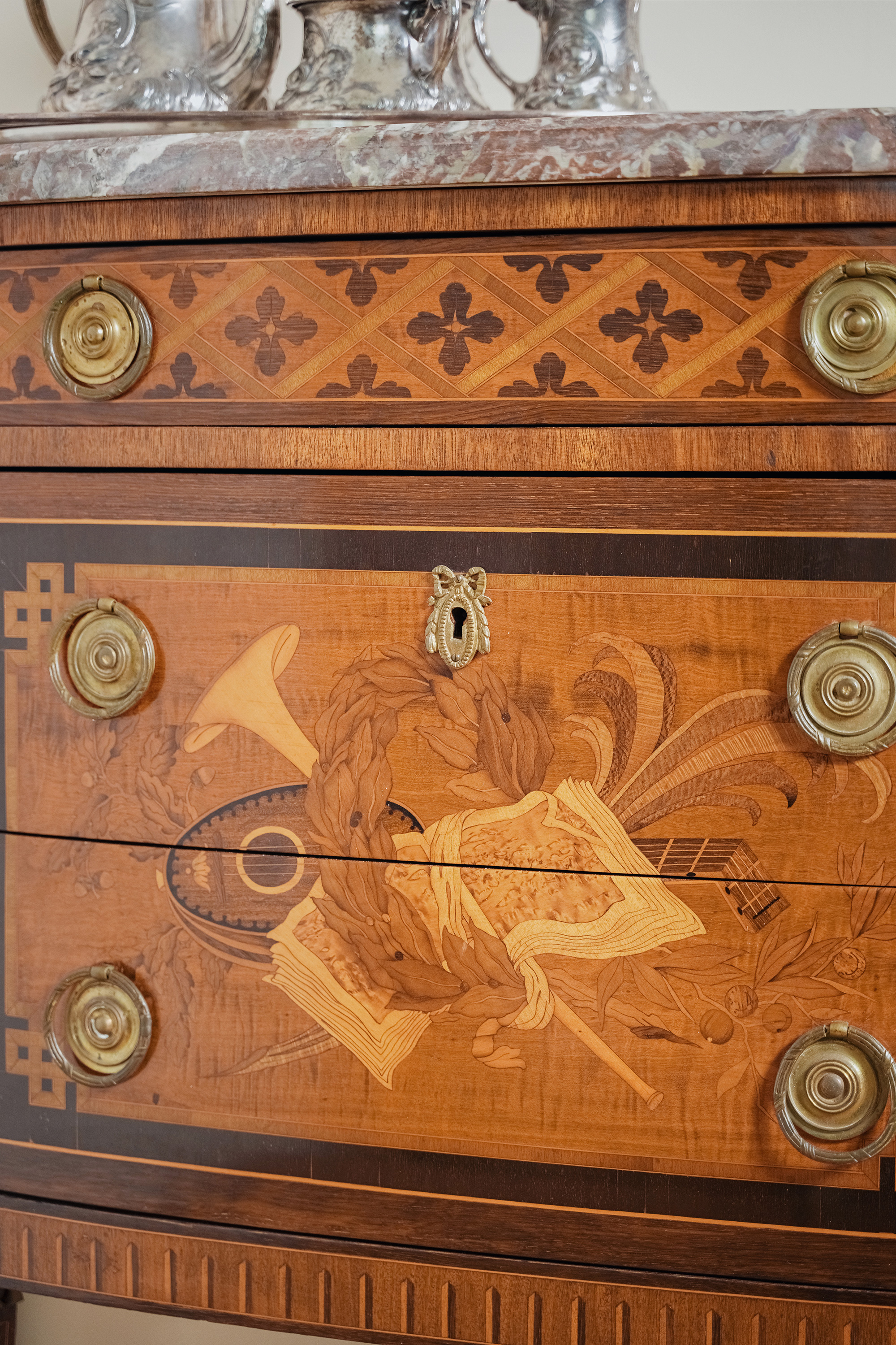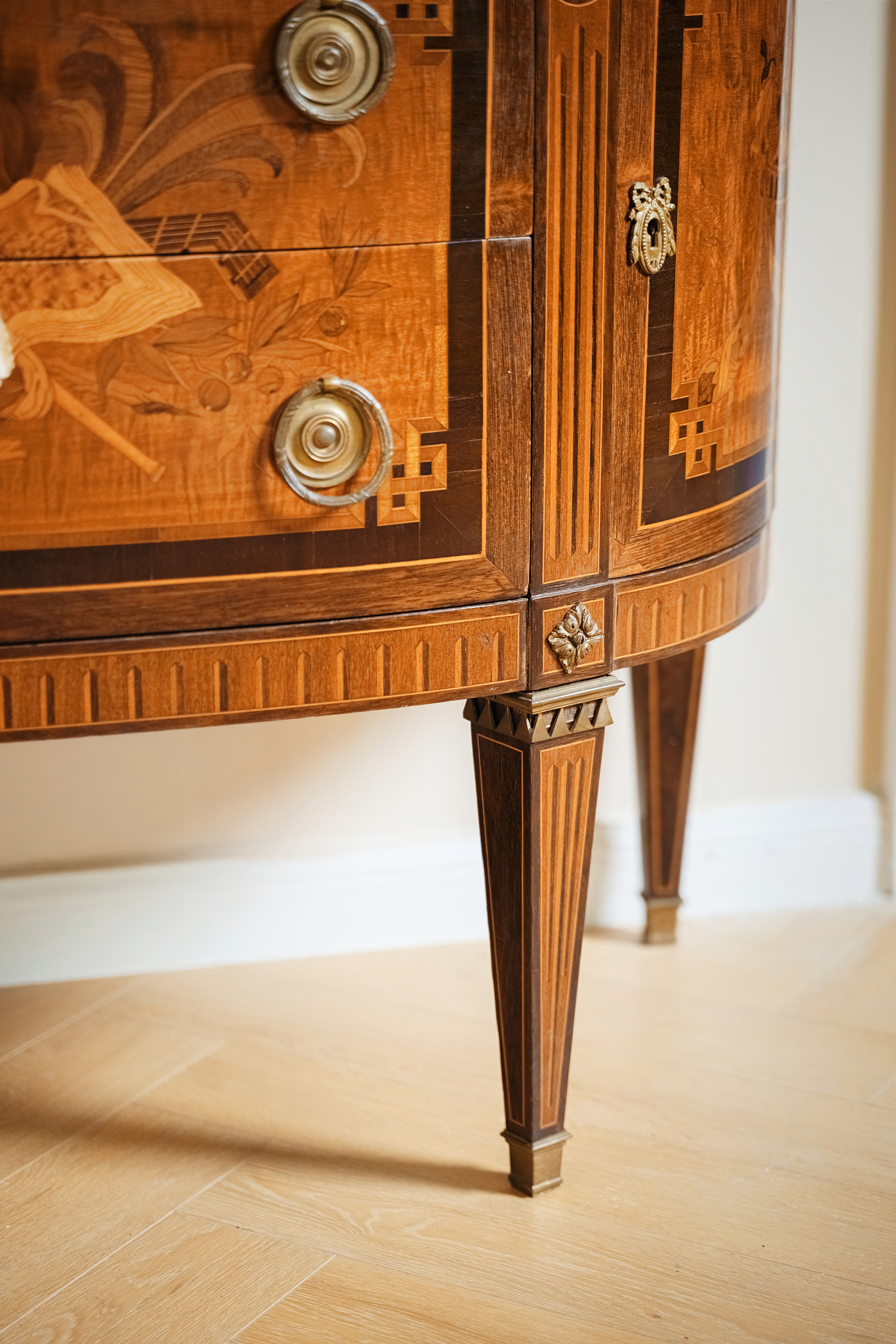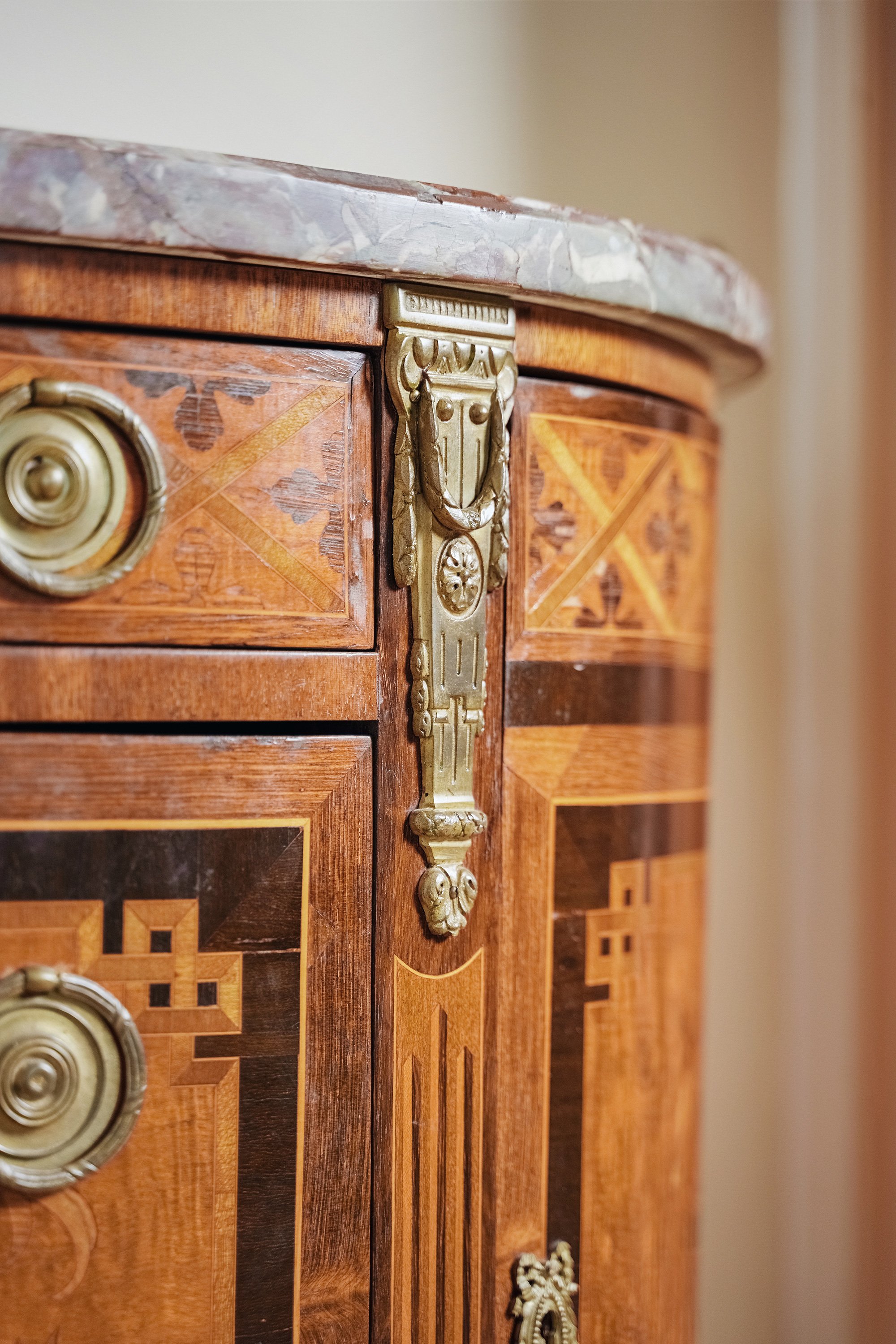19世纪末法国出品路易十六风格铜鎏金装饰大理石面细木镶嵌边柜